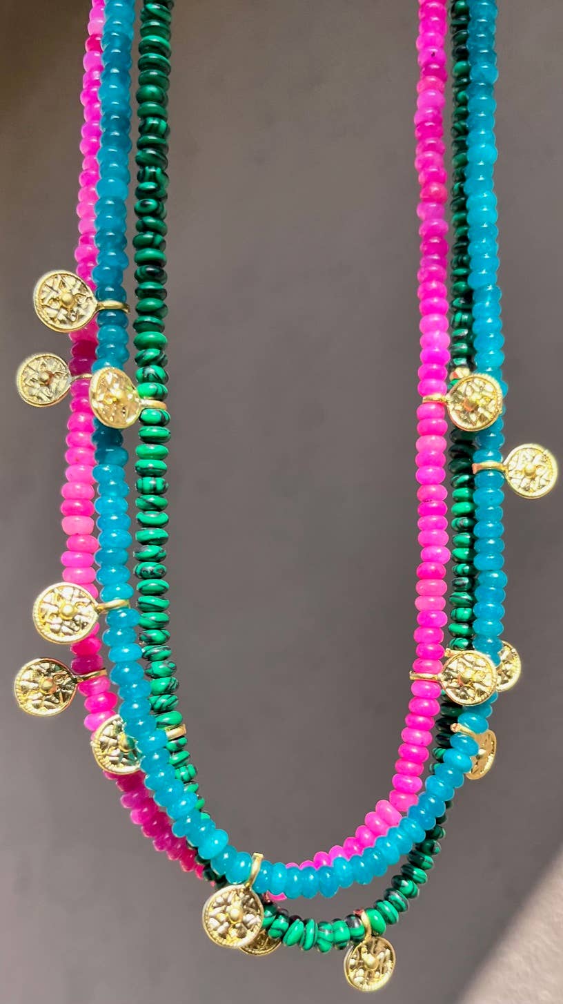 The Covited Collar Necklace är ett elegant dag-till-natt-lager. Den är handgjord med högkvalitativa ädelstenar och 22K matt guldpläterad detalj. Längd: 16" Stenar: Pärla, Lapis, Mocha Moonstone