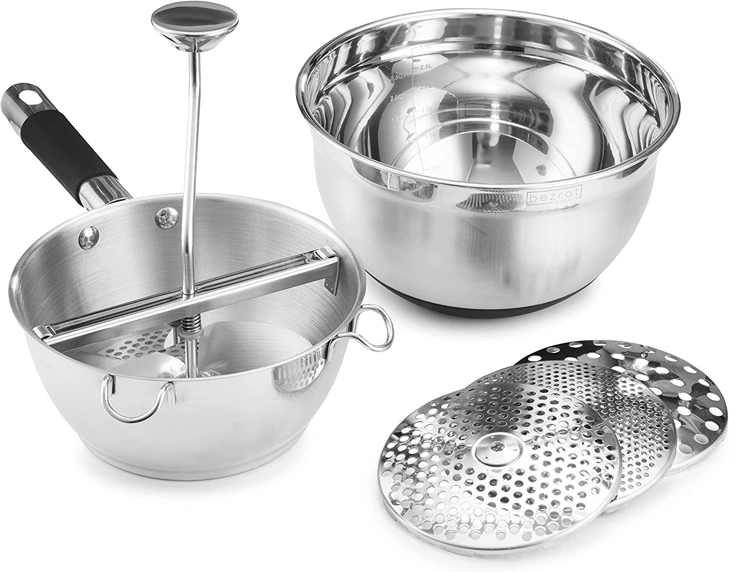 ✅ GILLAR DU POTATISMOS UTAN KLUMP? Bezrat premium rostfritt stål matkvarn är äntligen här. Den robusta konstruktionen i kombination med den lättanvända designen gör det enklare än någonsin att mosa mat ✅ MIXING BOWL Included-Non-slip Silicone Base-Håll din skål exakt där du vill att den ska vara oavsett hur passionerat du blandar med vår giftfria, halkfria silikonbotten. Denna topprankade blandningsskål är tillverkad med tjockare än industristandard rostfritt stål som kan hålla livet ut ✅ VAD KAN DU GÖRA MED MATFABRIKEN? Äppelmos, potatismos, ansträngda morötter, barnmat, grönsakssoppor, persikpuré eller halloncoulis. Använd BEZRAT Food Mill, som är speciellt utformad för att separera små frön från massan, vilket ger dig en smidig puré tomater till din hemlagade salsa ✅ UTBYTBARA MILL DISKS-3 slipskivor av rostfritt stål för beredning av livsmedel med fina, medelstora och grova texturer ✅ NON-SLIP HANLDES & ROUND BALL-3 halkfria ben gör att du kan placera på en kruka eller en skål