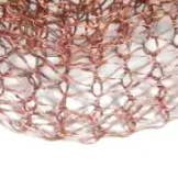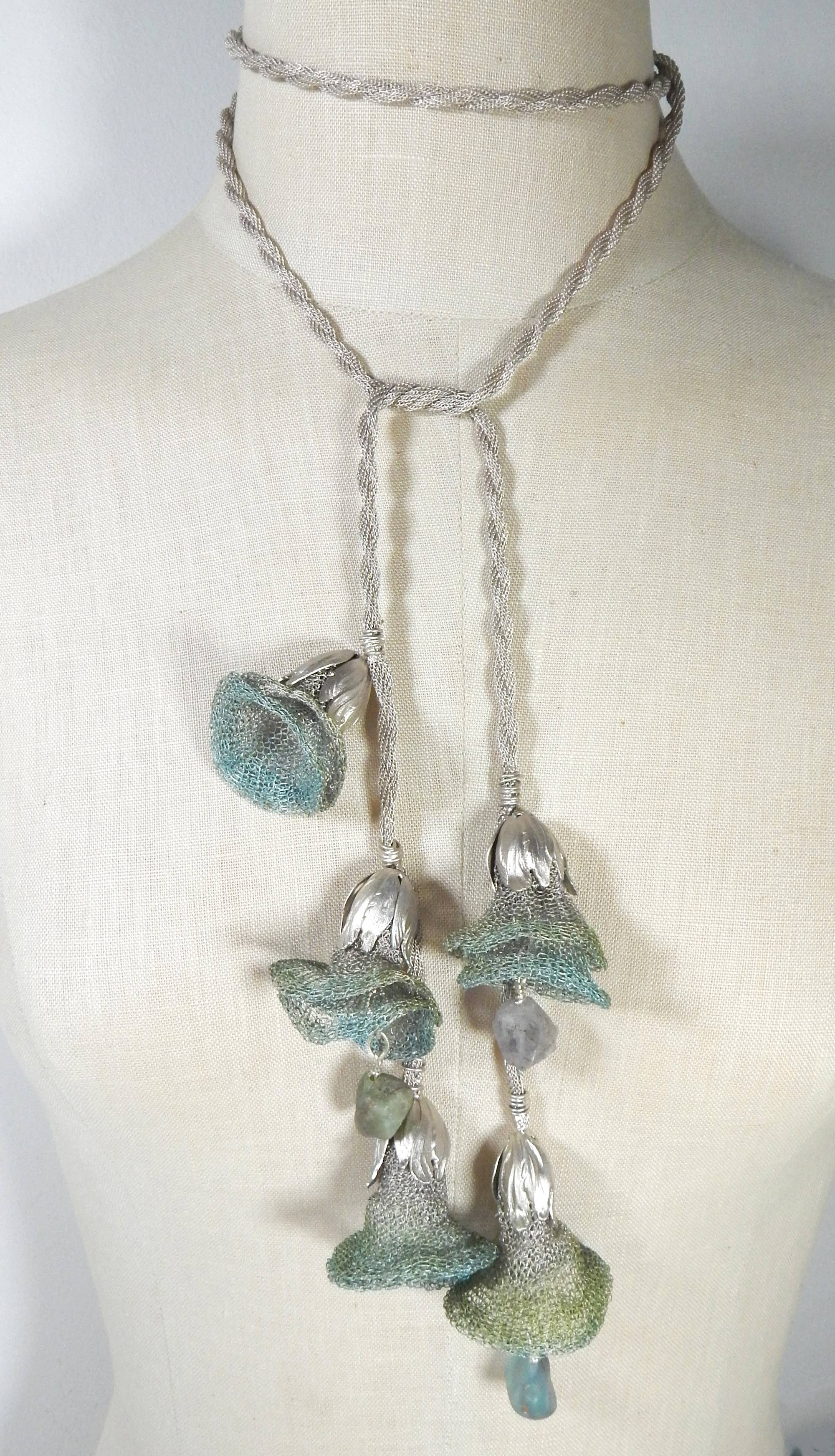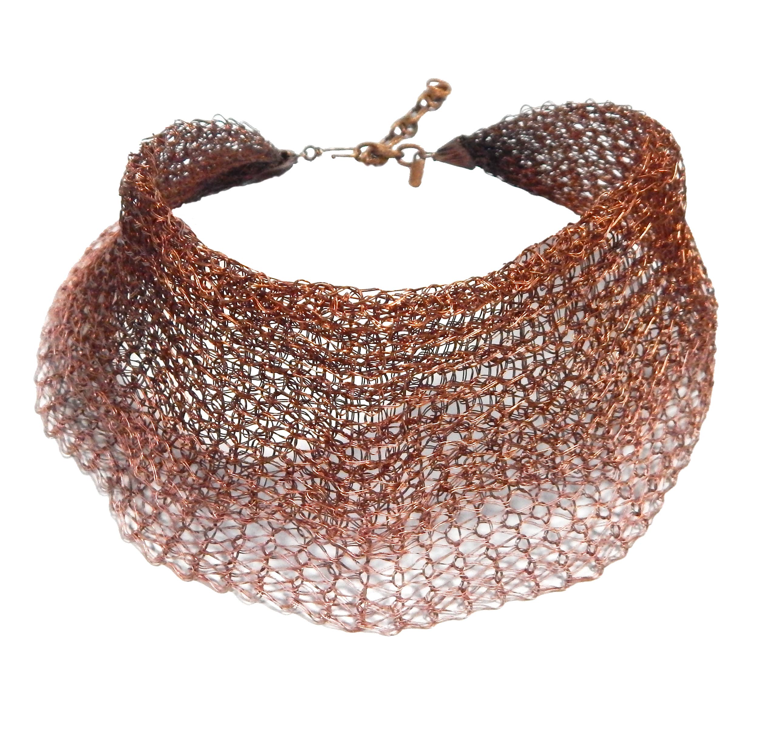 Metal Mesh Scarf gjord av fin tråd stickad koppar. Samlas och cinched, ruffled försiktigt med natursten accenter för att komplimangera färgen. 56 ”lång och ca 4" bred färdig. Det visas i lätt oxiderad koppar med kvarts och chartreuse. Den levereras med en 3 ”stift för att stänga den om så önskas. Koppartråd stickad tillverkad i USA, handformad och formad. Förseglad med lackbeläggning.