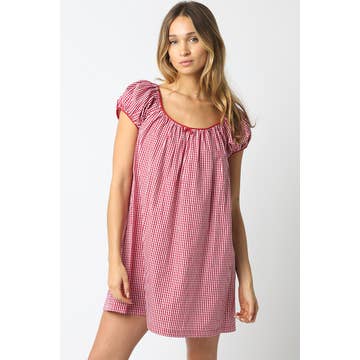Vår Lorelei-linnéklänning har puffärmar och en volangkant.