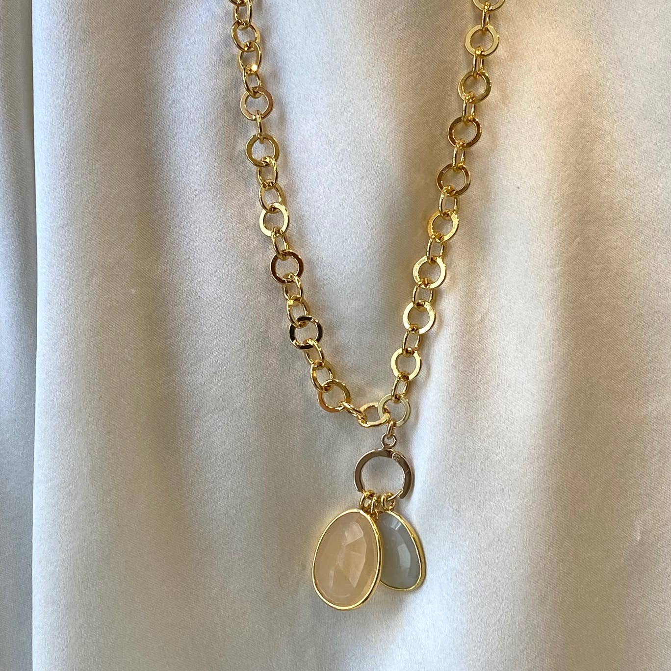 Det justerbara Pebble-halsbandet är för kvinnan som ser sina smycken som en väsentlig del av hennes uttryck. Hon gillar att ha mycket smycken i sin garderob, att lager på lager med avsikt, och vet hur man använder färg! I vår vårkollektion har vi fokuserat på nyanserna av kusttrender som dina kunder kommer att älska denna säsong. Pebble-halsbandet kombinerar den naturliga glansen av fasetterad månsten med den subtila skimret av emaljfrökedja. Dess mångsidighet och färgalternativ gör det till en bästsäljare för varumärket. Den enkla stenen ger en ren, modern touch, medan silikondistansen ger fullständig mångsidighet. Det är en tidlös bit som övergår sömlöst från avslappnade till formella miljöer. Vi har samarbetat inte bara med Anthropologie, Anthropologie Europe och Sundance, utan även med över 600 ytterligare återförsäljare över hela landet, och vi skulle gärna samarbeta med dig nästa gång! Hypoallergeniska, naturliga stenar, upp till 30" längd med hummerlås och ändkedja för att justera längden.