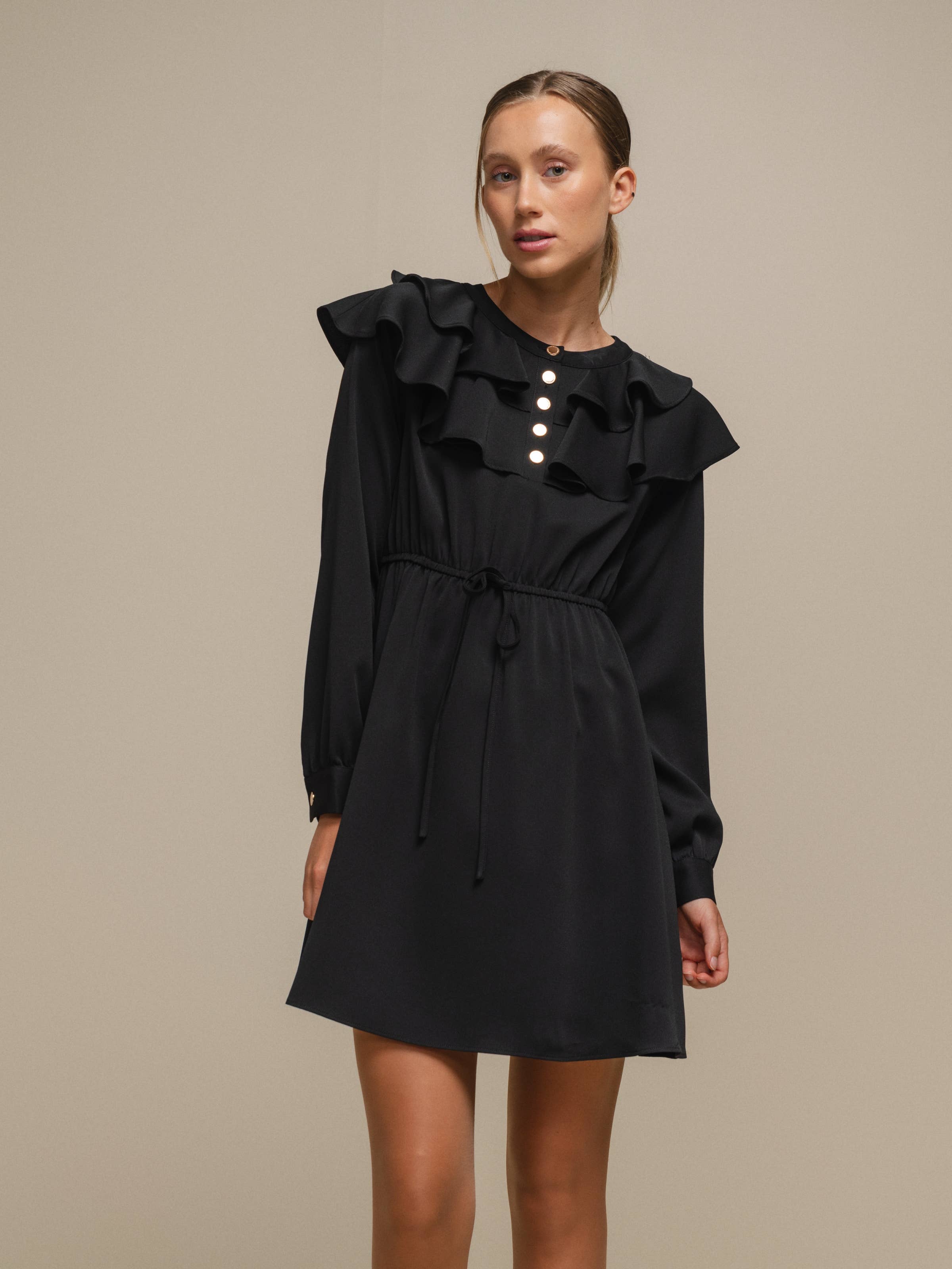 Kanelfärgad miniklänning i manchester med armbandshylsa, delad hals och veckad kantdetalj.