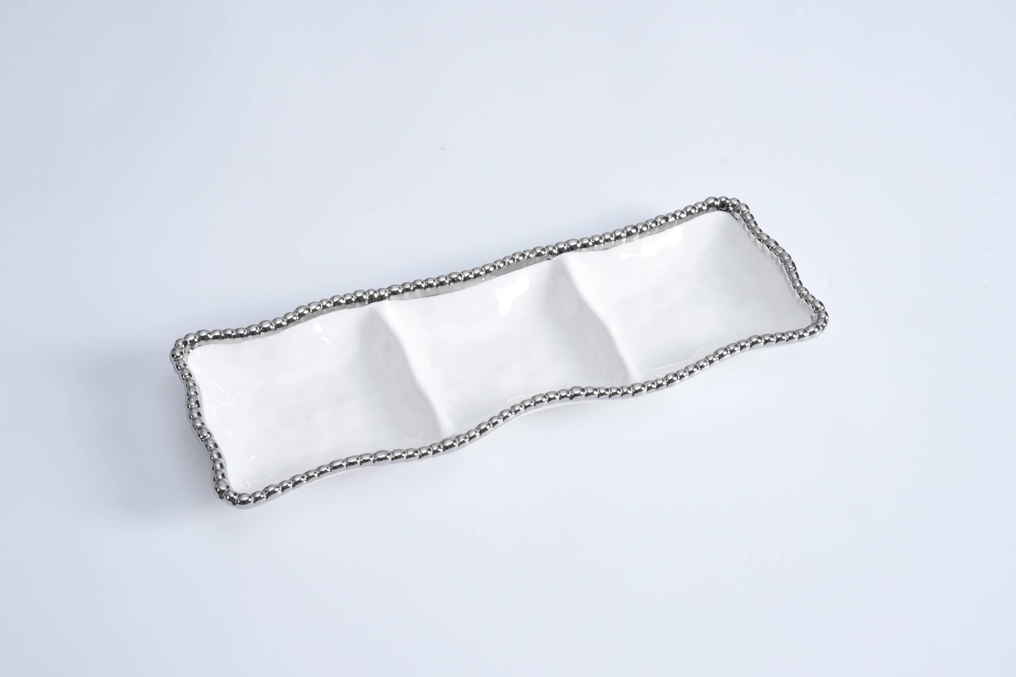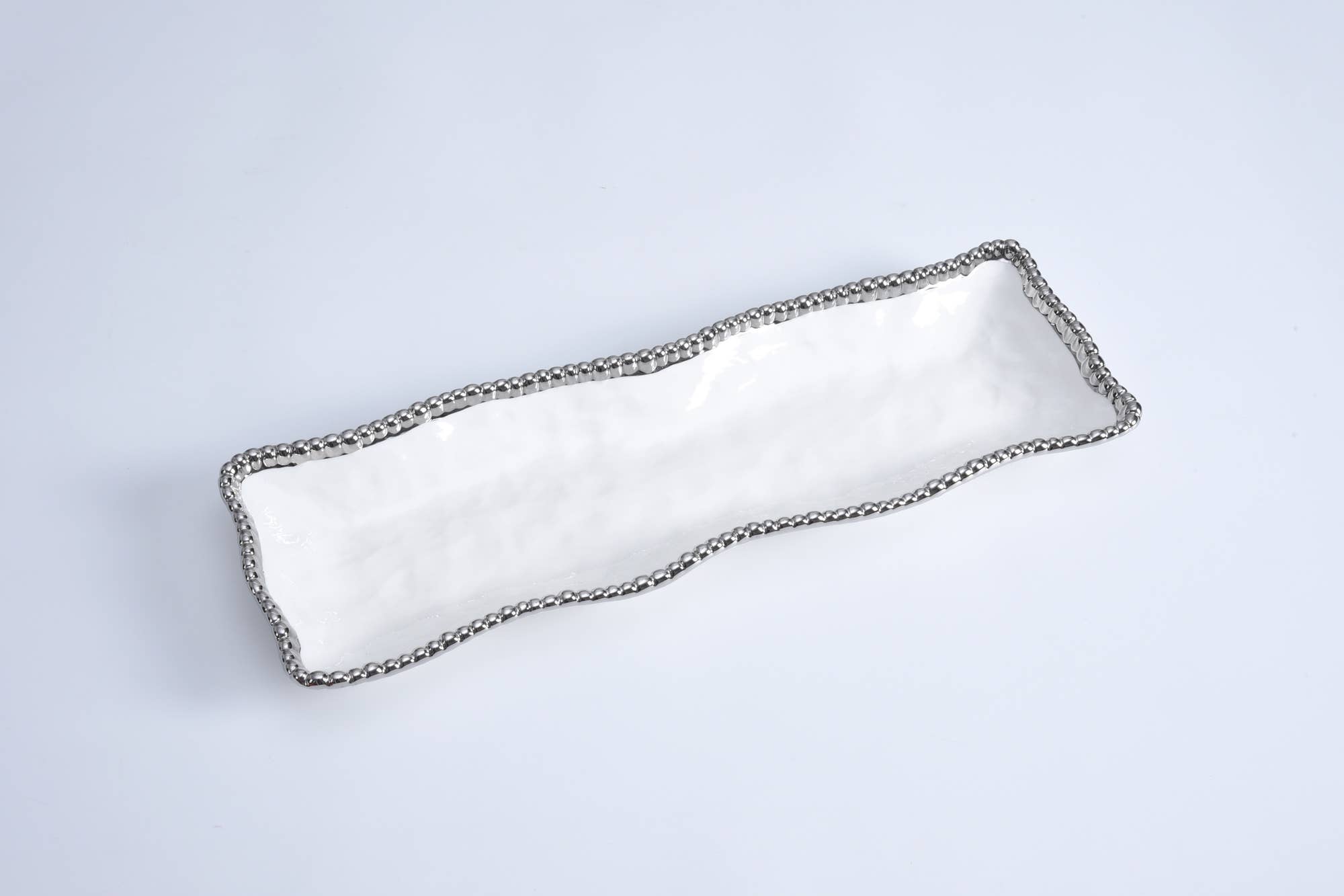 CER1150W Kexbricka från vår Salerno-kollektion. Perfekt för kex, småkakor och andra små godsaker. Denna skinande vita porslinsskål är prydd med glänsande silverpärlor i titan. Livsmedelssäker, diskmaskinssäker och ugnssäker upp till 550°F. Lättskött.
