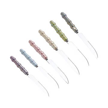 Färgglada berber-smörknivar handplockade och handgjorda med kärlek i Marrakech, Marocko, under våra många inköpsresor till vårt favoritland – perfekta för den ursprungliga serveringen av din tårta. Varje ikonisk och färgstark marockansk tårtkniv har ett något annorlunda randigt handtag i harts och metall. - Färgglada randiga handtag i olika kombinationer - Varje kniv är cirka 13,5 cm lång - Tillverkade i Marocko - Varje exemplar är unikt - Flerfärgad randig mix - Endast handdisk Handtaget består av flera ringar av färgad harts. Metallen är maillechort (en legering av koppar, zink och nickel) som starkt liknar silver. Om du föredrar en viss färgkombination är du välkommen att kontakta oss via PM eller ange dina önskemål vid beställning.