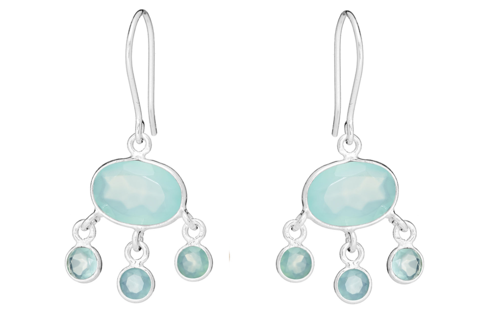 Underbara örhängen med tre nivåer av päronformade ädelstenar, alla kopplade ihop för att skapa en mild rörelse och smidighet i designen. Denna populära örhänge-stil finns i flera ädelstensvarianter - ta gärna in hela utbudet av Cascade Gemstone Earrings. Harriet bär våra Cascade Rose Quartz & Amethyst örhängen här och fotot ingår för att ge dig en känsla av hur örhängena ser ut när de bärs. Material: örhängena är gjorda av sterlingsilver och är infattade med iolit, ametist och kalcedon. Detaljer: örhängena har en enkel krokarmatur och den totala droppen är 5,5 cm. Varje örhänge är satt med 7 päronformade ädelstenar och dessa är ungefär 5 x 7 mm i dimension. Detta är den perfekta mors dag-presenten.