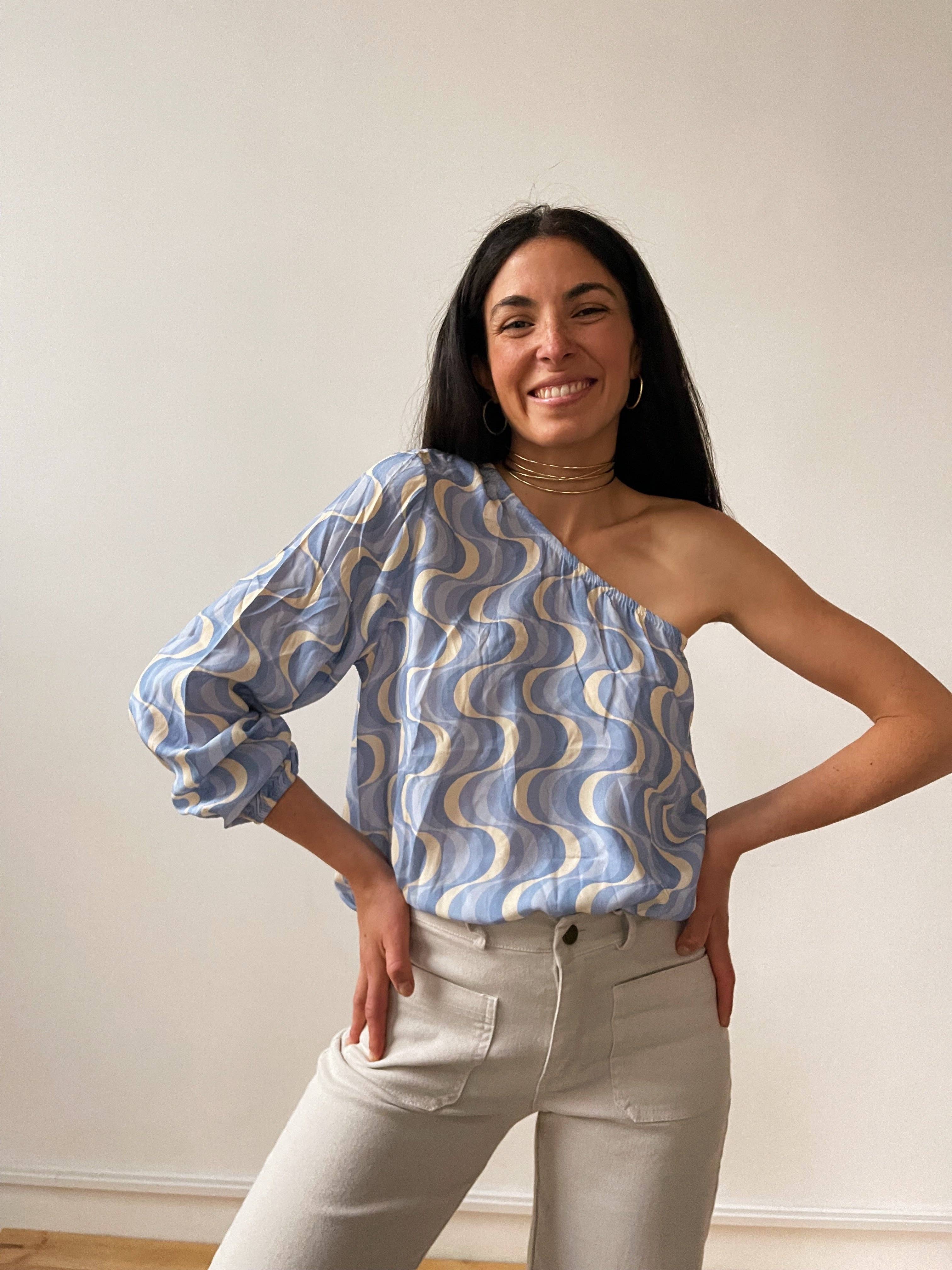 Asymmetrisk topp med tryck och 3/4-ärm avslutad med resår. Sammansättning: 100% viskos Tvätta i 30º Modellen är 166 cm lång och bär storlek S.