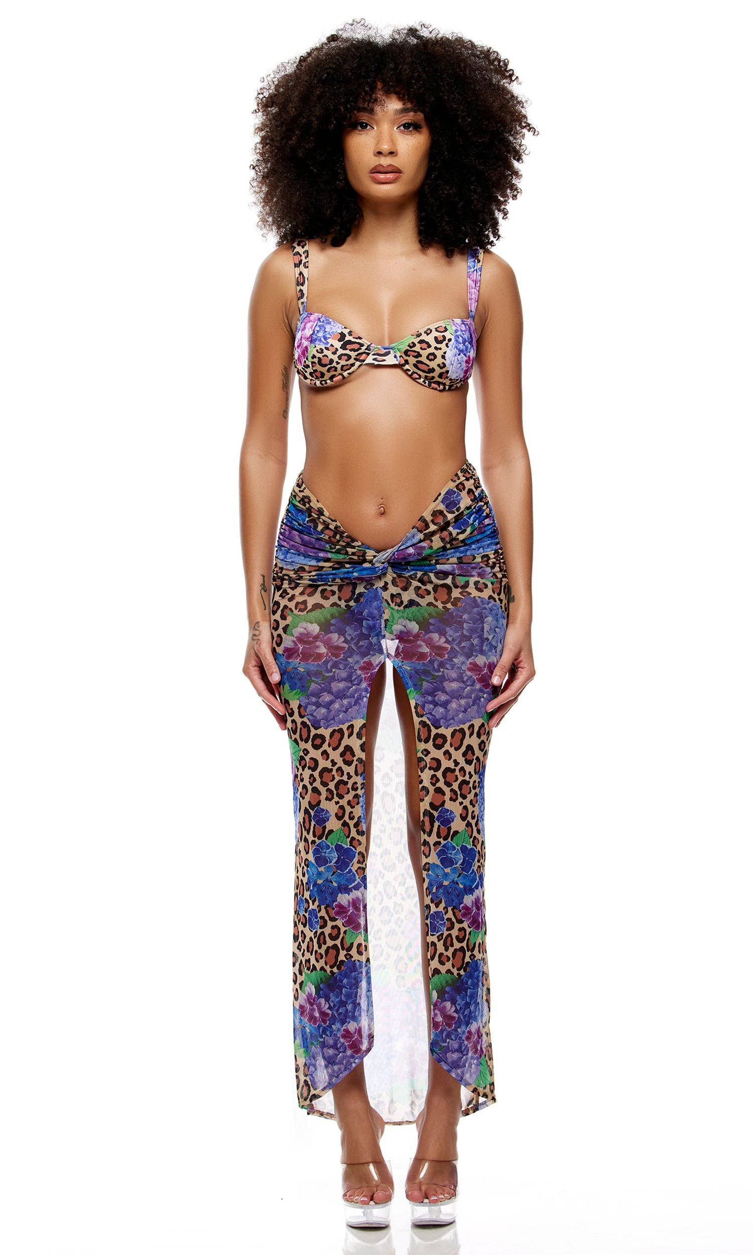 2-delad tryckt triangelhalter-bikiniset med rynkade kanalsnören och shorts. VARNING: I enlighet med CA Prop 65 kan denna produkt utsätta dig för kemikalier som är kända av delstaten Kalifornien för att orsaka cancer eller reproduktionsskador.