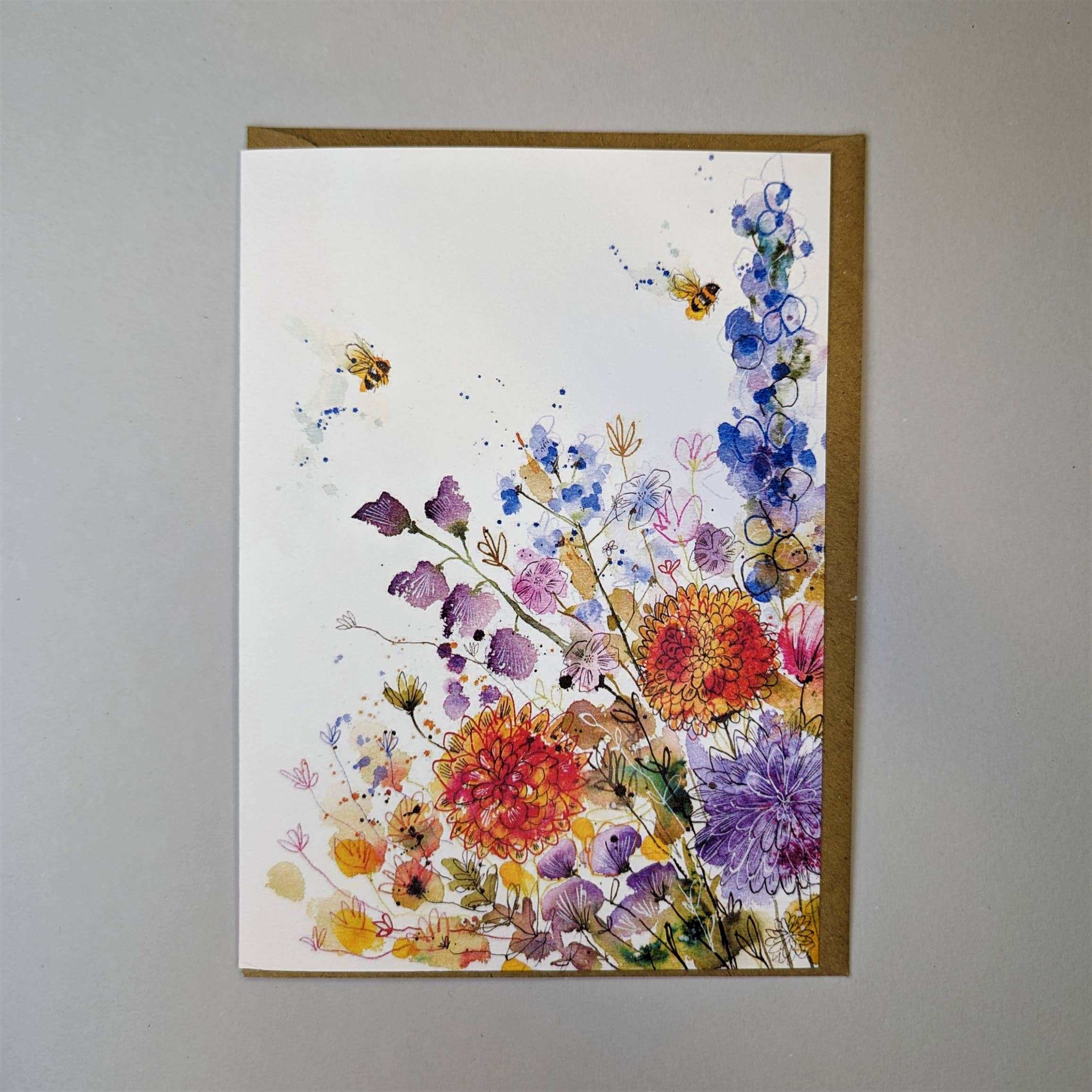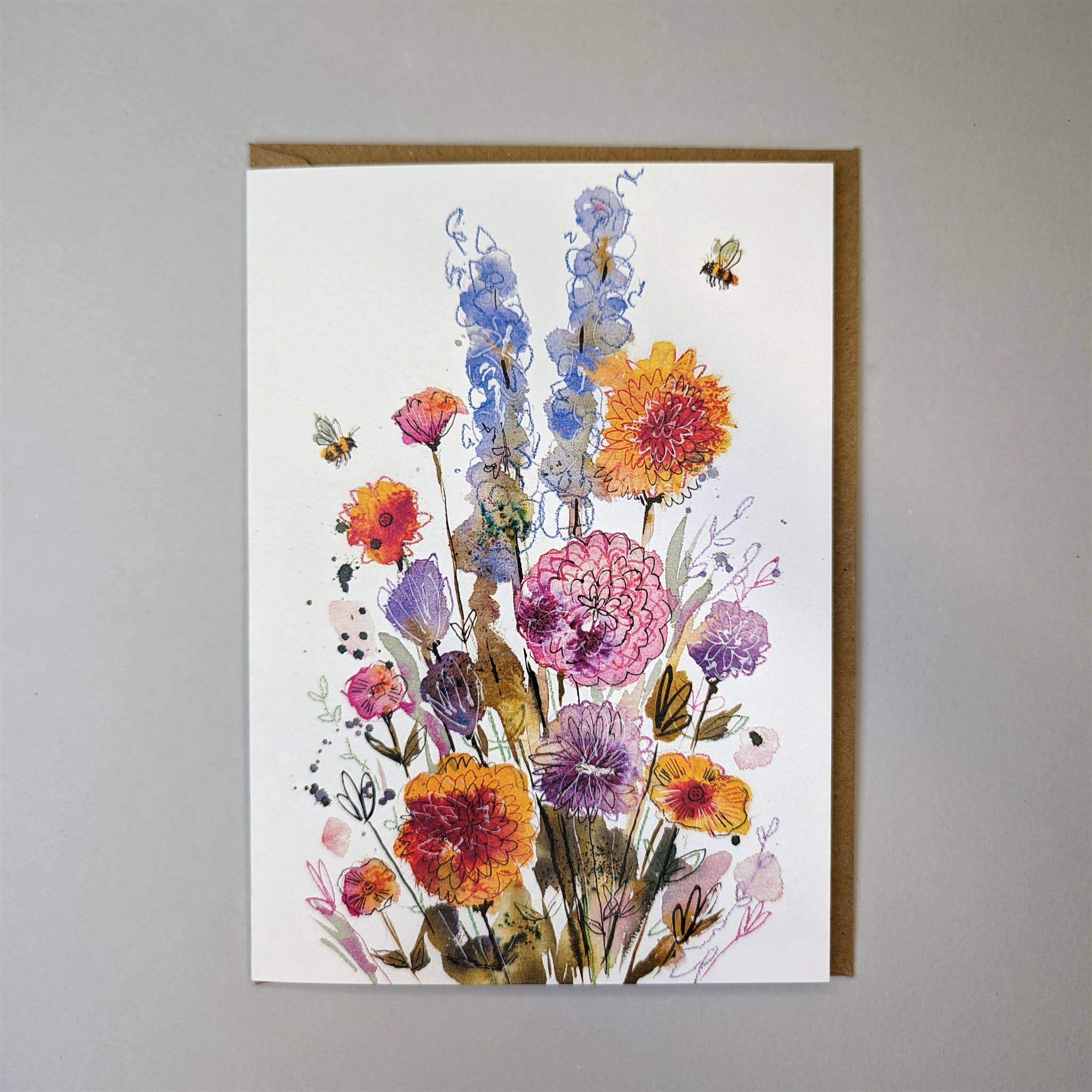 5x7-tums gratulationskortdesign togs från en original akvarell- och bläckmålning av en mängd blommor som vissa bin åtnjöt. Som konstnär på heltid och trädkramare på deltid har dessa kort gjorts av papper som har anskaffats ansvarsfullt.