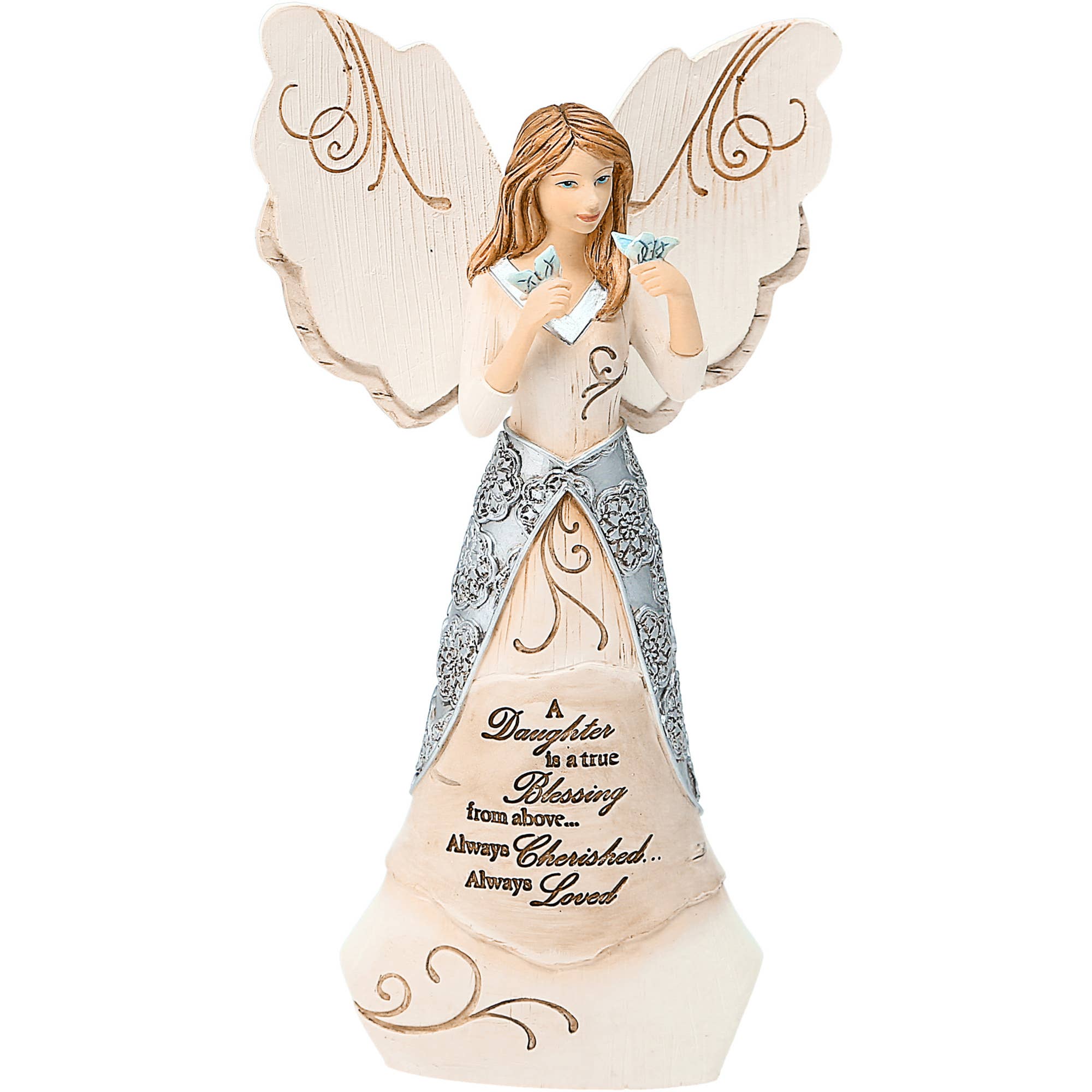 8 ”ängelstatyett, förpackad i en silverfärgad present-to-go-tryckt låda, är tillverkad av polyresin. Texten ”Friends Are Gifts To Always Treasure” är präglad och handmålad på ängelns framsida, tillsammans med en invecklad silverdesign och blomma. Det finns skumkuddar på botten för att förhindra att ytor repas. Damm med en torr trasa. Denna hjärtliga ängel är en perfekt gåva för att välsigna en vän eller familjemedlem. Hon kommer att älska denna sentimentala figur i många år framöver. Sätt på en silverbåge på lådan och den är redo att gåva!.