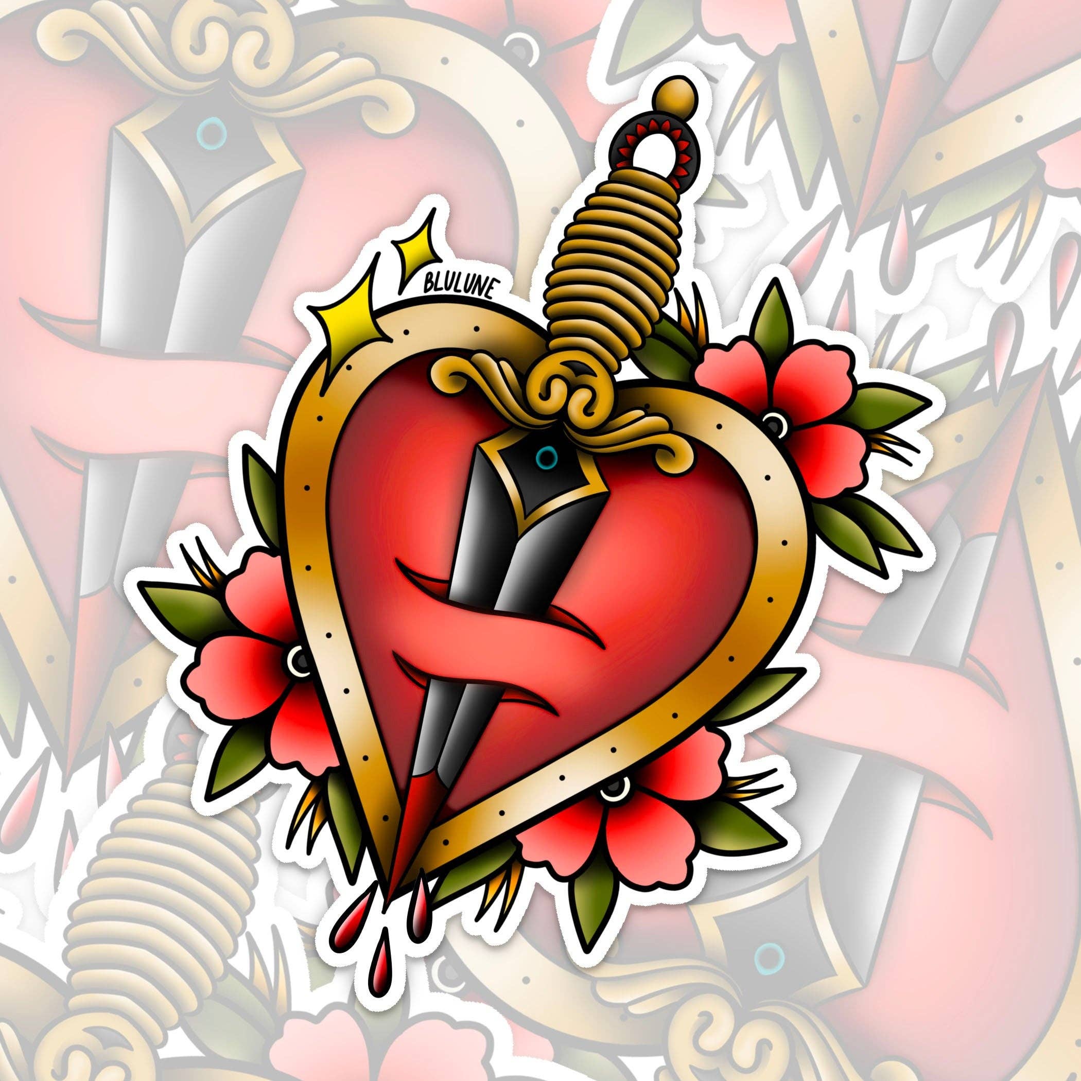Konstklistermärken, Tufft hjärtklistermärke, Tatueringsmotiv, Rosor hjärtan, Vintage tatueringsstil, Vintage klistermärke