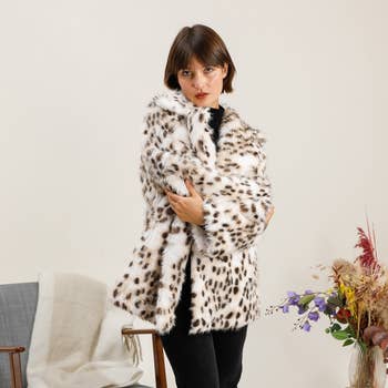 Kort damjacka i fuskpäls med huva