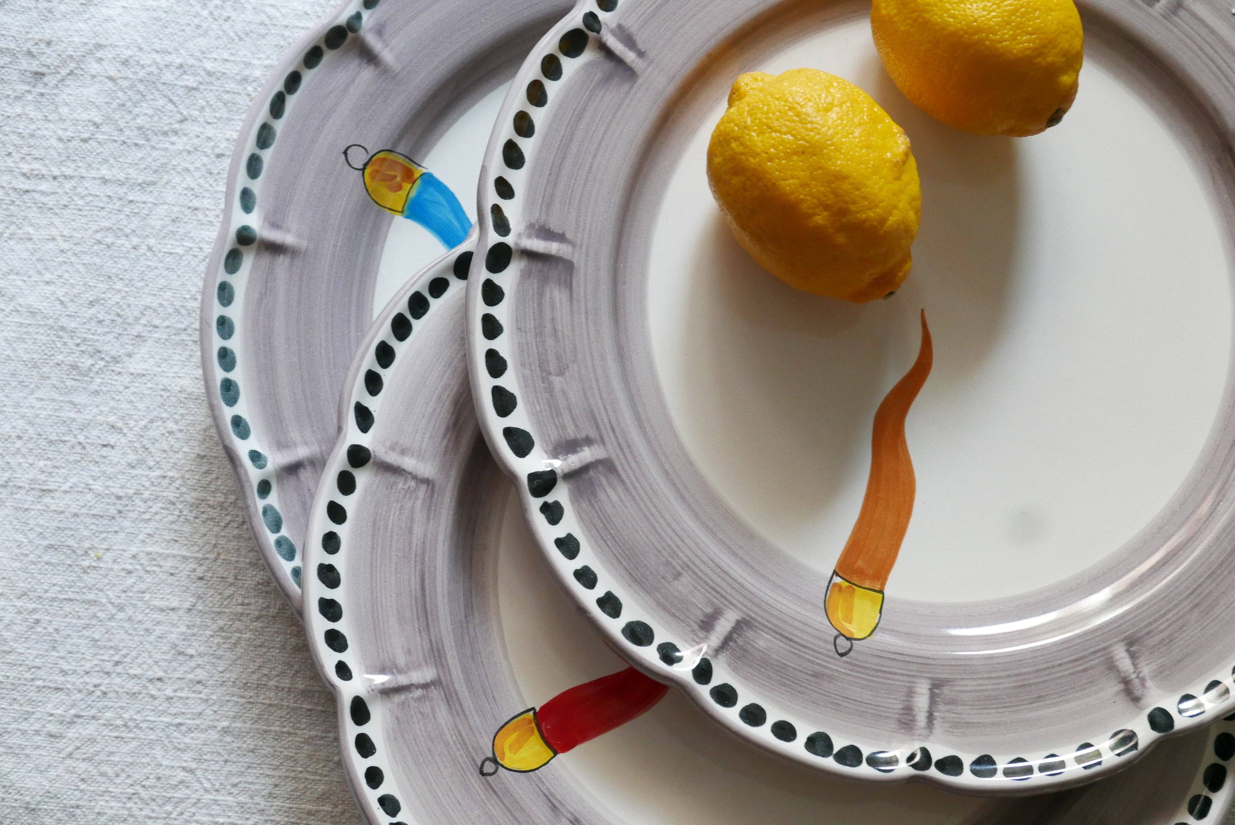 18-delars porslin N.6 Platta tallrikar i vitglaserad keramik med turhorn, dekorerade för hand. Ø24 cm. N.6 Vitglaserade keramiska sopptallrikar med turhorn, dekorerade för hand. Ø24 cm. N.6 Vitglaserade keramiska frukttallrikar med turhorn, dekorerade för hand. Ø20 cm På begäran och på Flaire kompletterar serveringsbitar tjänsten: ovala och runda tallrikar, salladsskålar, koppar i olika storlekar och kaffe. Tål maskindisk Kan användas i mikrovågsugnen. Kan inte användas i ugnen