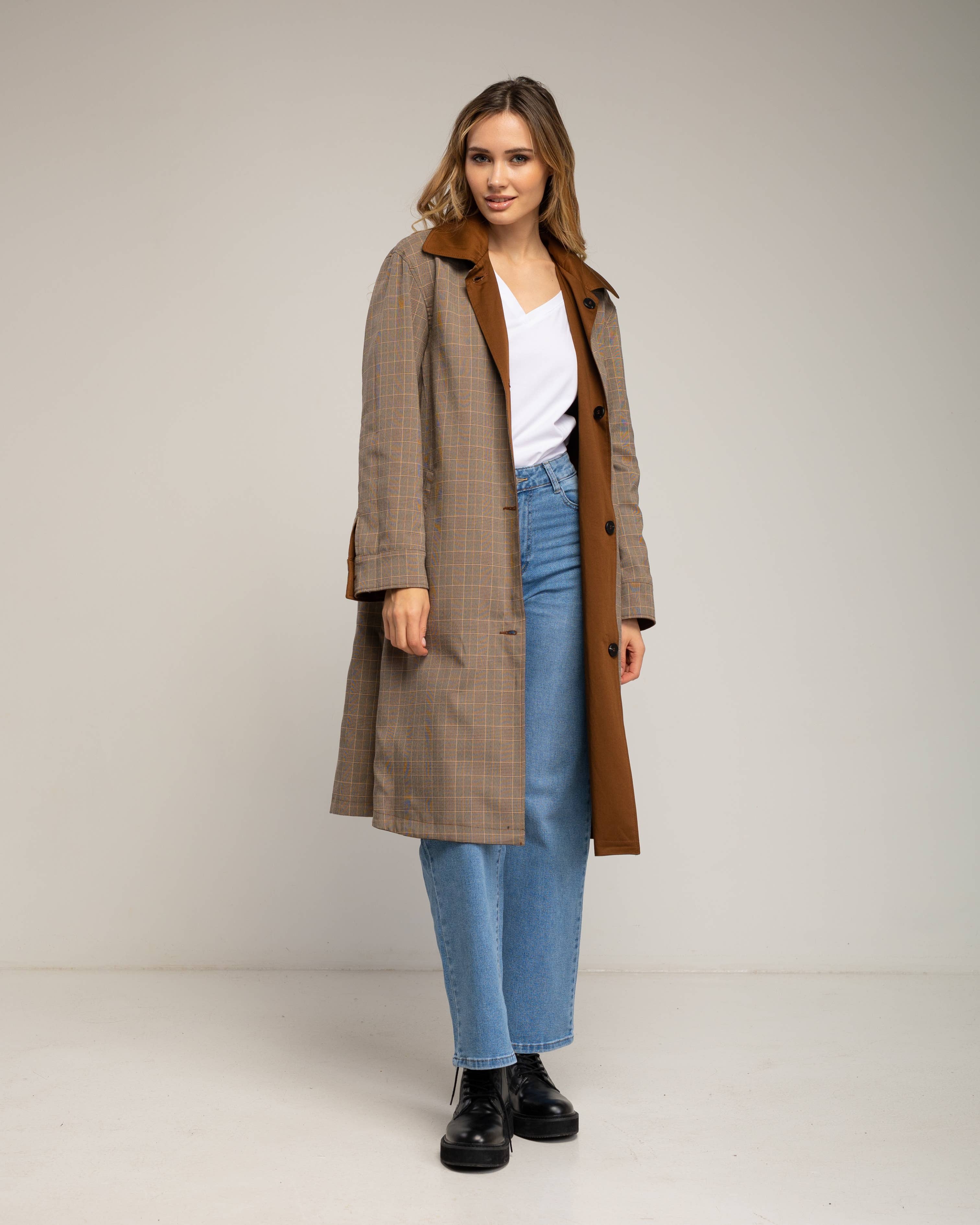 Lång trenchcoat med geometriskt rutmönster i svart och vitt, ett elegant och tidlöst plagg som höjer vilken mellansäsongslook som helst med en sofistikerad och modern touch. Den vida och flytande designen ger rörelse och komfort, medan den klassiska kragen och den centrala knäppningen med stora knappar förstärker dess raffinerade estetik. Det lätta tyget garanterar ett perfekt fall, idealiskt för att bäras öppet eller stängt beroende på tillfälle. Perfekt att kombinera med skräddarsydda byxor, midiklänningar eller mer avslappnade outfits, denna mönstrade trenchcoat är den perfekta allierade för urbana stilar, arbetsdagar eller speciella tillfällen där du vill sticka ut med stil.