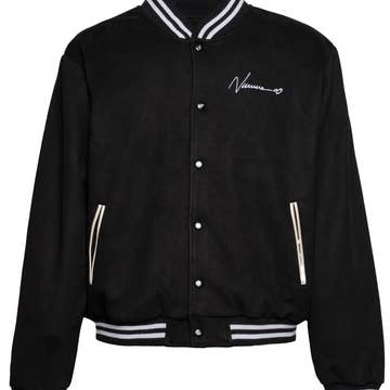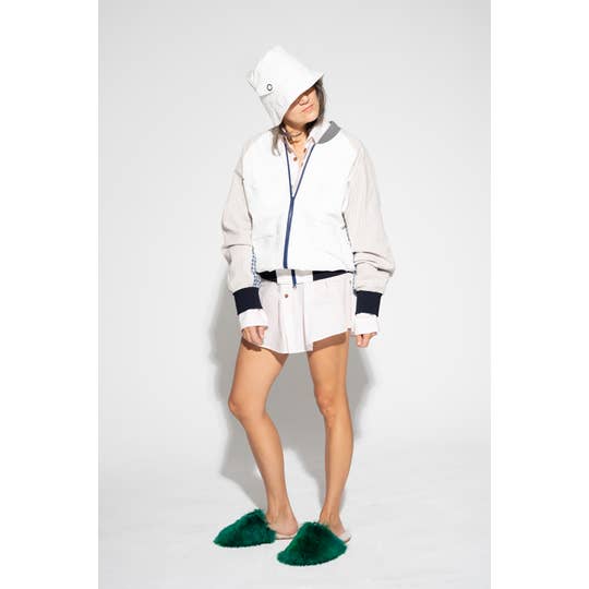 En kraftig bomberjacka tillverkad av ekologisk mjuk ull i en dramatiserad ottomansk söm med kalvläderdetaljer längs sidorna och ärmarna. En geometrisk och definierad silhuett med breda axlar och en knäppt midja. Två fickor, hög krage, ribbade muddar samt kraftigt foder för premium isolering. Främre knäppning med tryckknapp mitt fram. Endast kemtvätt 100% Ull