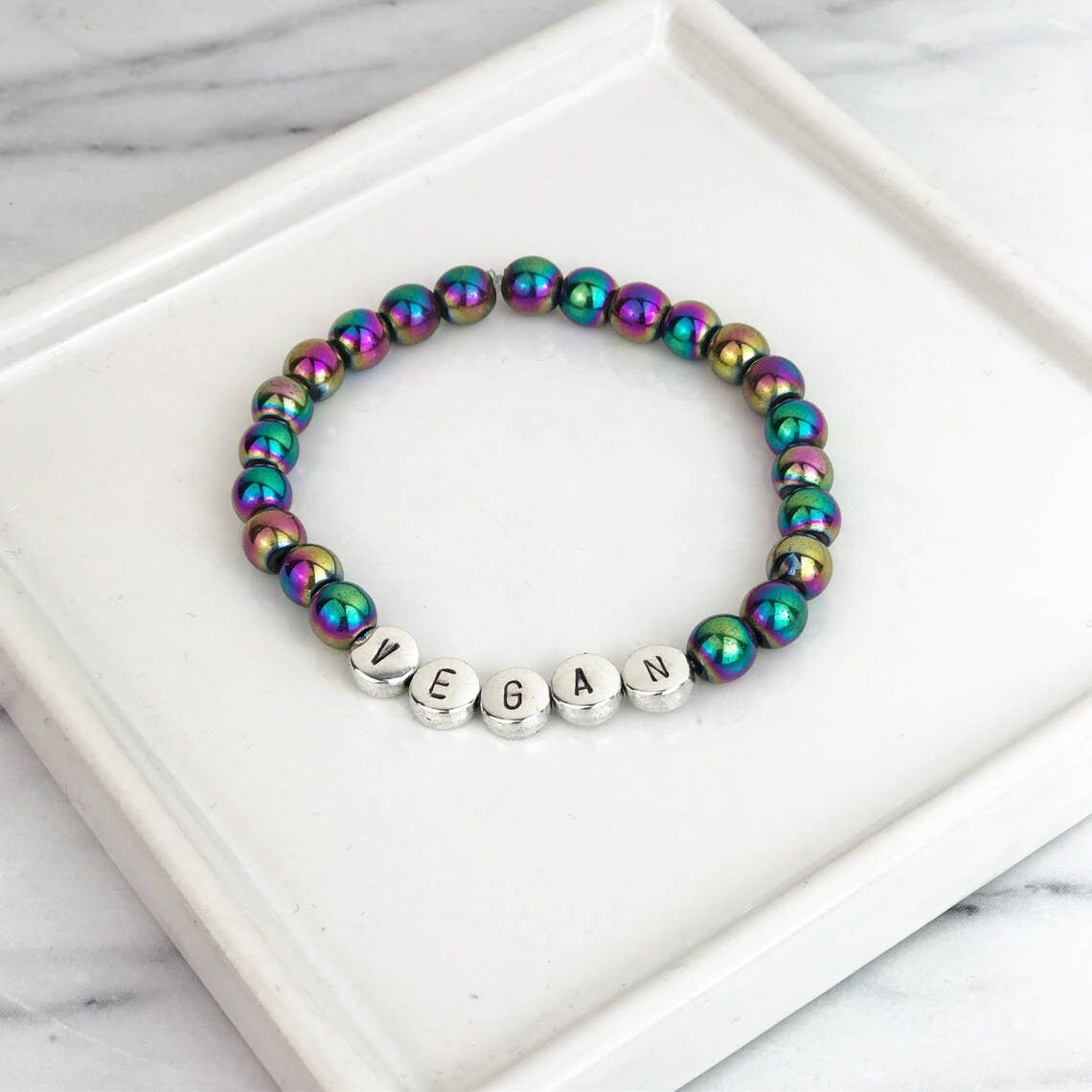 Silverarmband med pärlor och handstämplade silverbokstäver som accent samt åtta pärlalternativ (silver eller olika ädelstenar). Pärlorna är 6–7 mm i diameter. Elastiska armband som passar de flesta vuxna handledsstorlekar. Om du önskar ett specifikt mått, vänligen meddela vid beställning. Handgjort på Irland. Anpassningsbart. Vi kan ändra eller lägga till valfria bokstäver eller symboler från vårt sortiment på begäran. Kontakta oss med instruktioner. Pärlor kan även blandas vid önskemål. Övriga stilar i bilder visas enbart för illustration.