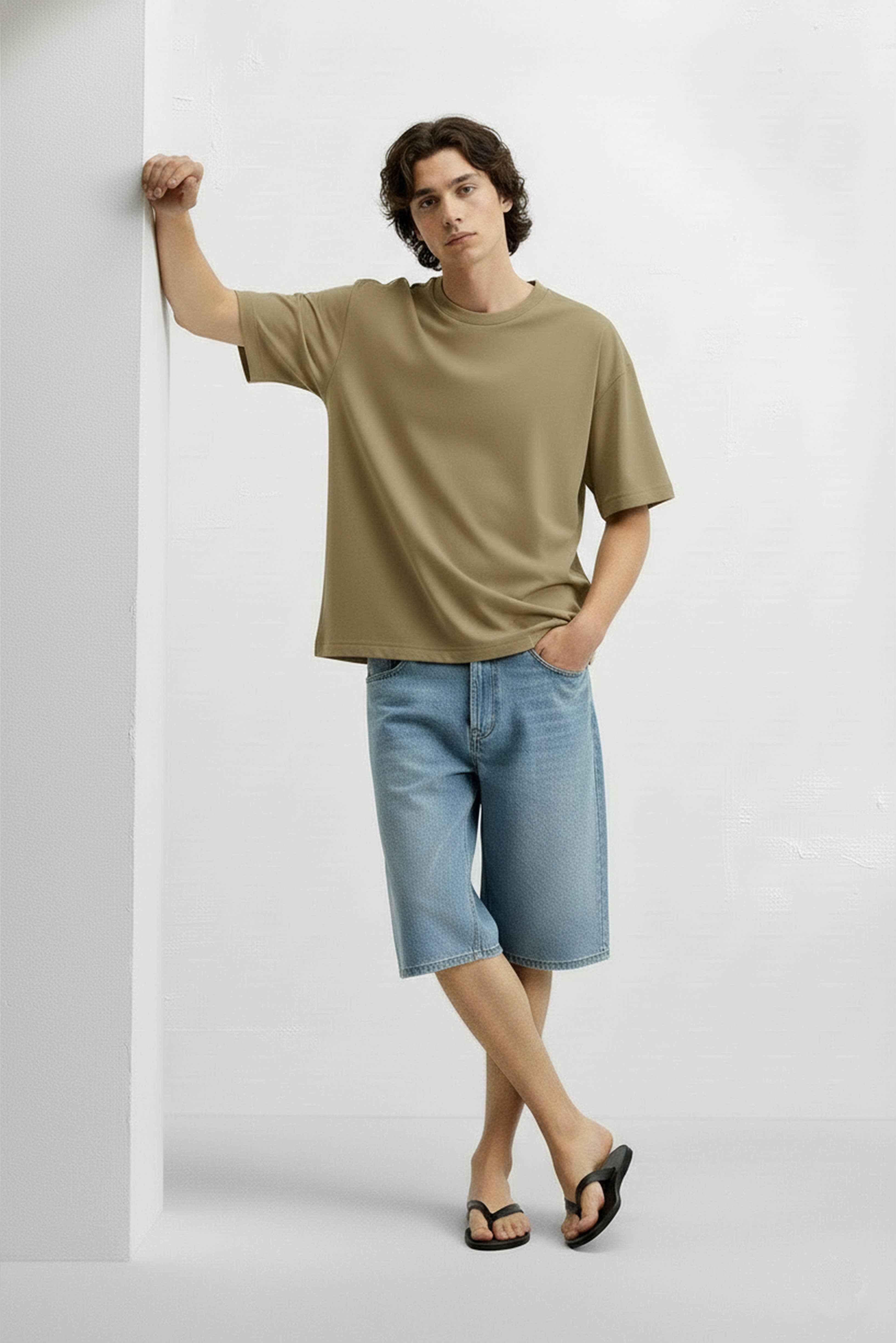 Herr-T-shirt i oversized bomull med kort ärm, sandfärgad