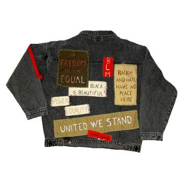 CROP DISTRESS DENIMJACKA HAR ETT BRETT TRYCK PÅ RYGGEN, NEDERKANT, LÅNGA ÄRMAR, KRAGE, KNÄPPNING FRAM, BRÖSTFICKOR OCH LÅNGA ÄRMAR. (TVÄTTRÅD: KALL DELIKAT/SKONSAM HANDTVÄTT. HÄNG BARA TORRT.) 86% BOMULL 8% RAYON 6% POLYESTER TILLVERKAD I KINA TRYCKT I USA