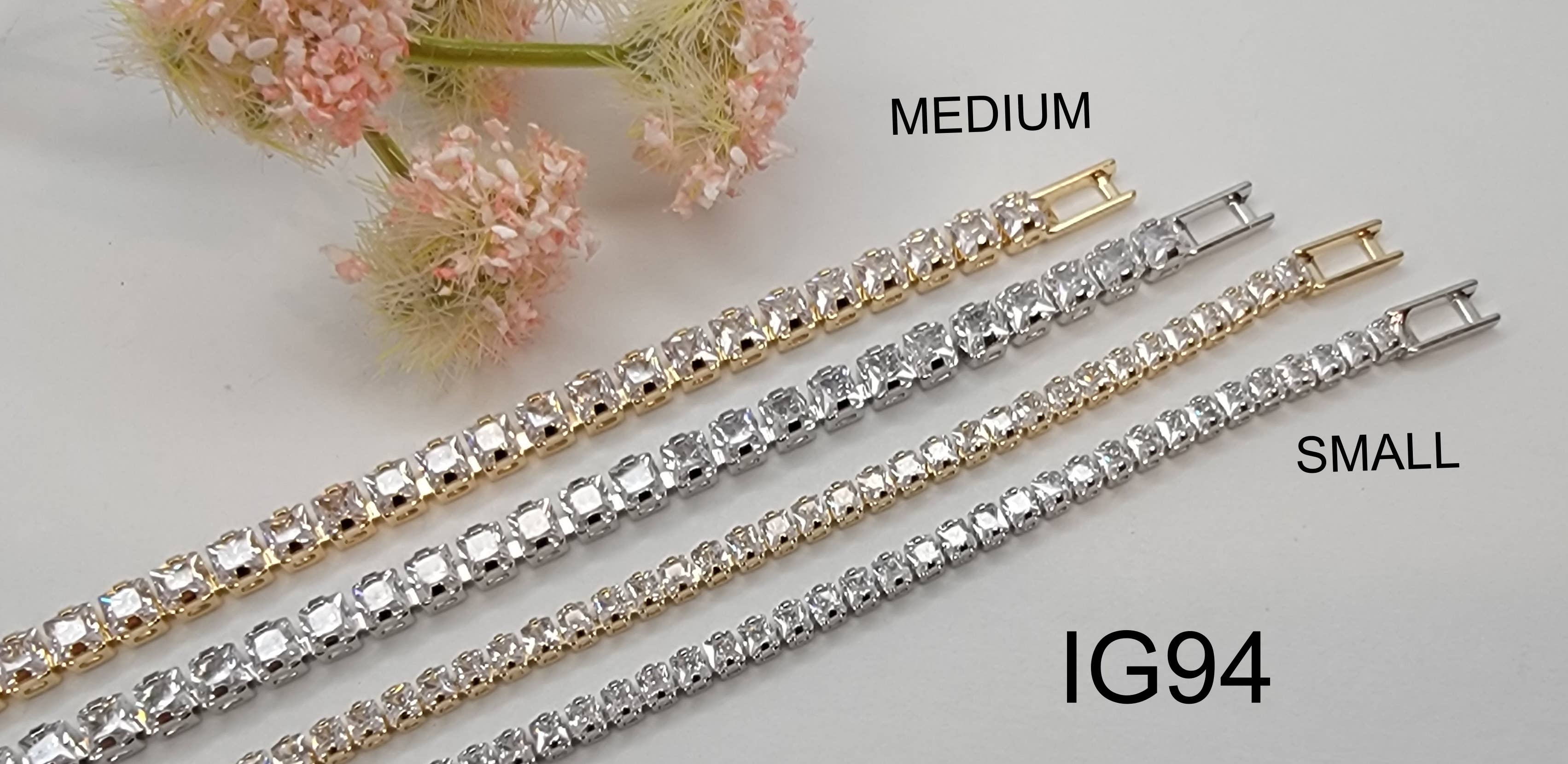 CZ. FYRKANTIGT STENARMBAND. MATERIAL: CUBIC ZIRKONIA, RHODIUMPLÄTERAD, BLY- OCH NICKELFRI. LITEN STENSTORLEK: 3/32" X 3/32" (VARJE STEN) MEDELSTOR STENSTORLEK: 1/8” X 1/8” KEDJELÄNGD: 7" ARTIKEL# IG94