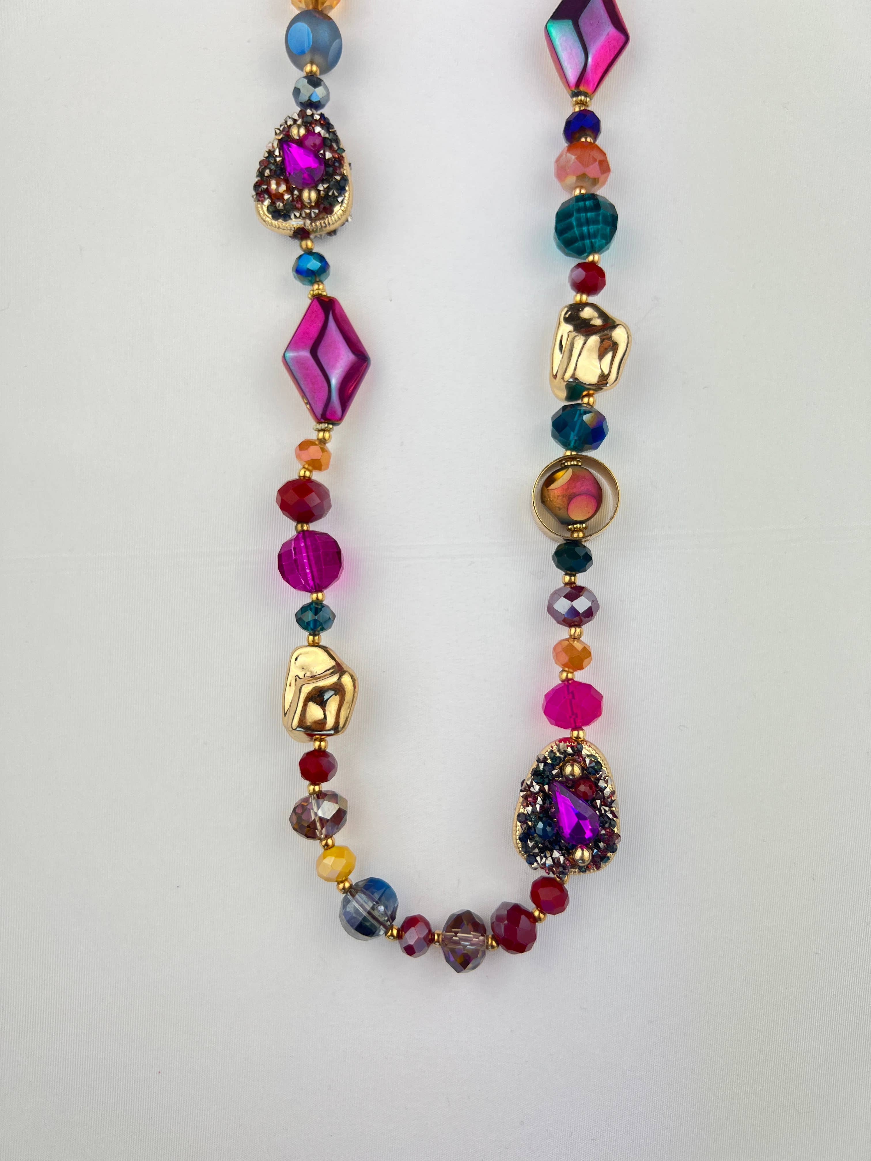 Arabella är en slående lariat gjord av elektropläterad mässing som faller ner i ett kluster av vita barockpärlor. Kan bäras lång eller kort. Finns även i silver. 36"