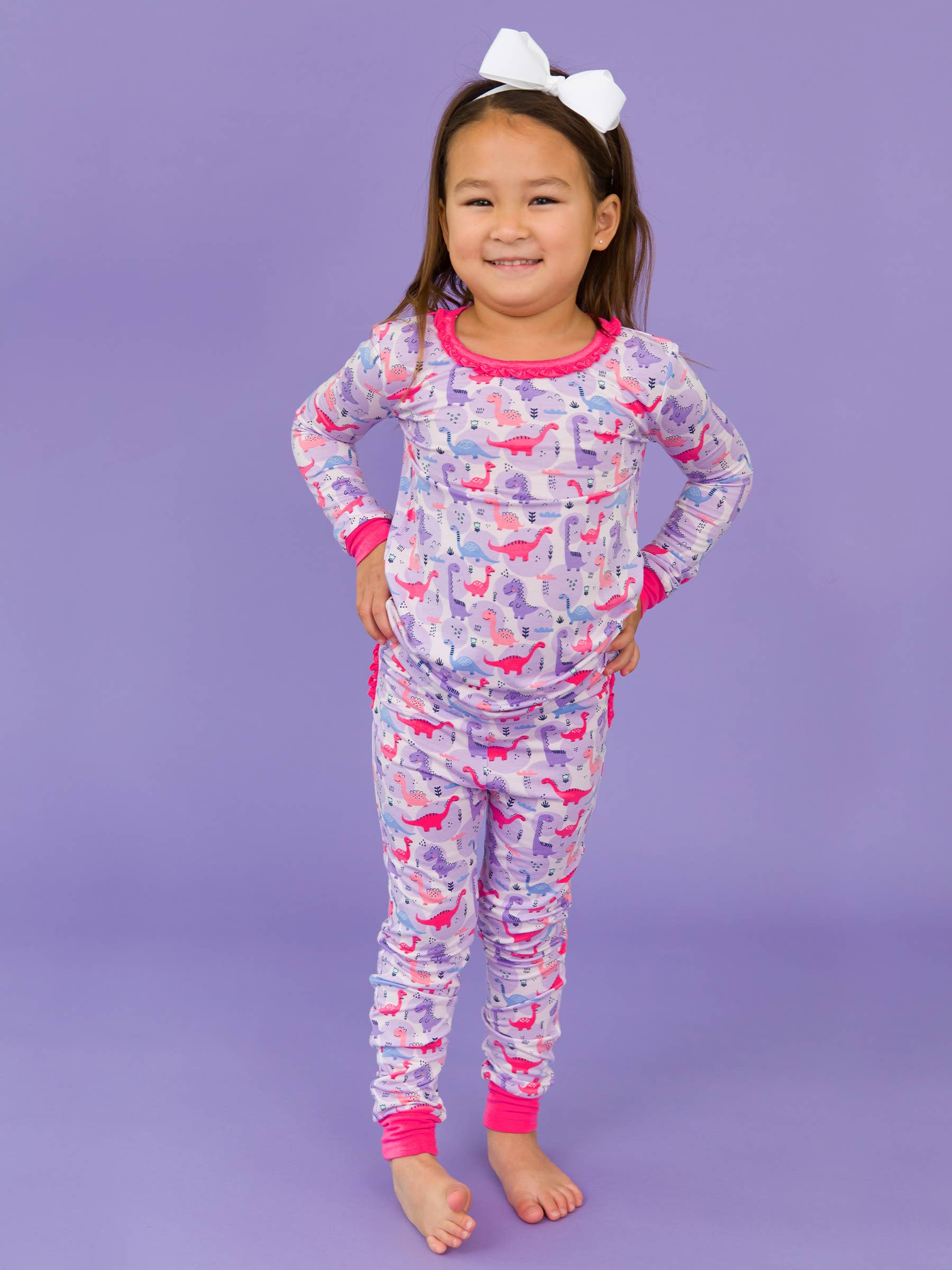 Denna volangpyjamas är mjuk och mysig mot barnets hud, med söta volanger som kommer att få dig att le. En tvåvägsdragkedja gör blöjbyten enkla, så att alla kan få en god natts sömn. Grepp på fötterna hjälper tidiga vandrare att ha stadigt fotfäste. Med vikbara vantar på storlekarna Nyfödd och 0-3 månader. Etikettfri för extra komfort. Tillverkad av vårt premium SoftSnooze™ bambuviskosmaterial, dessa pyjamasar är supermysiga, andas och är skonsamma mot känslig hud. Perfekt för att hålla sig varm på vintern men sval på sommaren. Den väx-med-mig stretch innebär att växande små kan bära dessa pyjamasar längre! Vem säger att dinosaurier inte var rosa och lila? Passar bra med Bubblegum Pink, Lavender, Periwinkle Blue, Hot Pink, Dark Navy. Skötselråd: Maskintvätt kallt; endast icke-klorblekmedel vid behov; torktumla på låg värme / För att förhindra skador och förlänga plaggets livslängd, använd tvättpåse i tvättmaskin och torktumlare. Materialinnehåll: 95% Viskos, 5% Spandex Referenskod: G3497