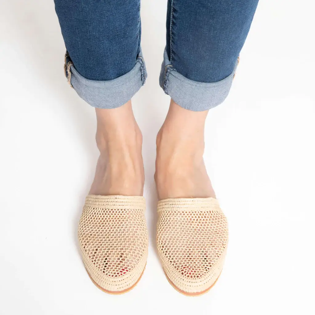Vi presenterar lockelsen i Marocko med våra handgjorda marockanska raffiaskor i elegant natur. Dessa hantverksmässiga underverk är här för att omdefiniera din skokollektion och ersätta sömlöst dina sandaler, espadriller och tofflor. Mångsidiga nog att komplettera både västerländsk och marockansk klädsel, dessa skor erbjuder en exceptionell blandning av komfort, lätt lätthet och tidlös stil. Dessa hållbara underverk kommer direkt från Marocko och är födda från ett unikt hantverk som väver naturlig raffia till ett mästerverk av skor. Sulorna är noggrant tillverkade av återvunnet läder, vilket återanvänder lyxiga fabriksöverskott. Varje par marockanska Raffia-skor är kärleksfullt handgjorda av underbetjänade marockanska samhällen, vilket ger dem ekonomisk egenmakt samtidigt som de förespråkar miljövänliga produktionsmetoder. Kliv in i en värld av hållbar stil med dessa extraordinära marockanska Raffia Shoes.
