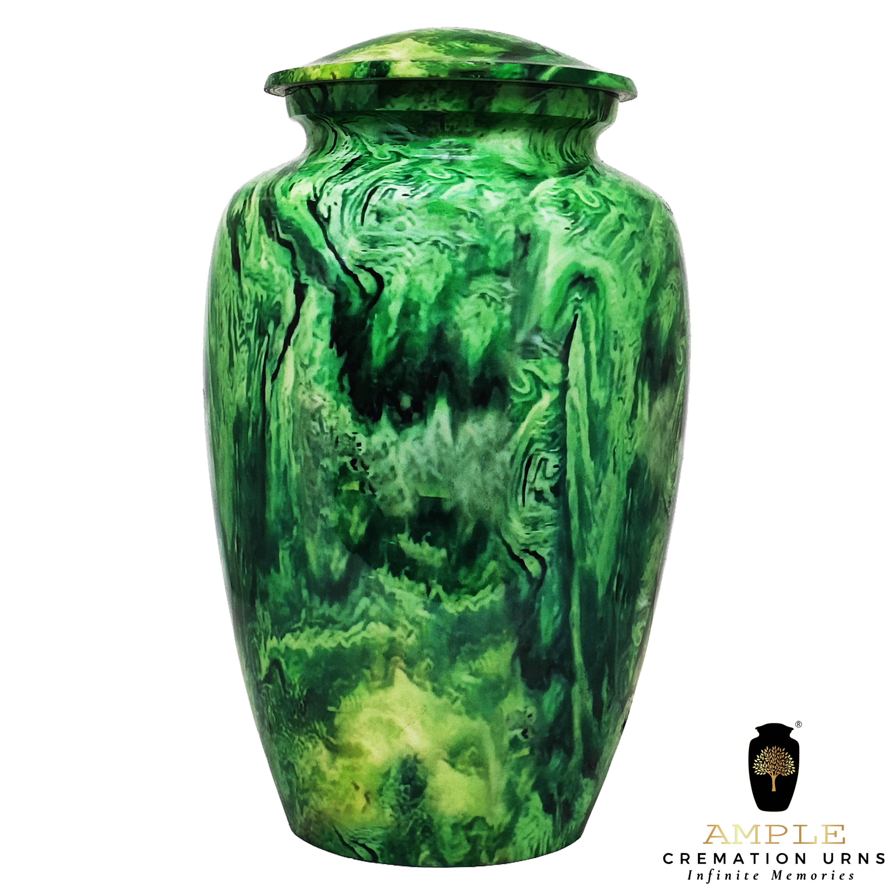 Fira ett liv vackert levt med vår Smaragdgröna & Silver Mässing Kremationsurna. Denna slående urna har en rik smaragdgrön emaljfinish med ett subtilt skalmönster, accentuerat av intrikata handgraverade silverband på locket, axeln och basen. Den strålande finishen och den traditionella formen gör den till en graciös och meningsfull hyllning till din älskade. Material: Premium solid mässing Finish: Glansig smaragdgrön med handverktygad textur Accenter: Handgraverade silverblomband Kapacitet: 200 kubiktum (standard vuxenstorlek) Mått: Ca. 10,5" H x 6,5" B Locktyp: Gängat lock för en säker försegling Användning: Lämplig för visning hemma, begravning eller placering i en nisch Handgjord med omsorg av Ample Cremation Urns, där elegans möter minne.