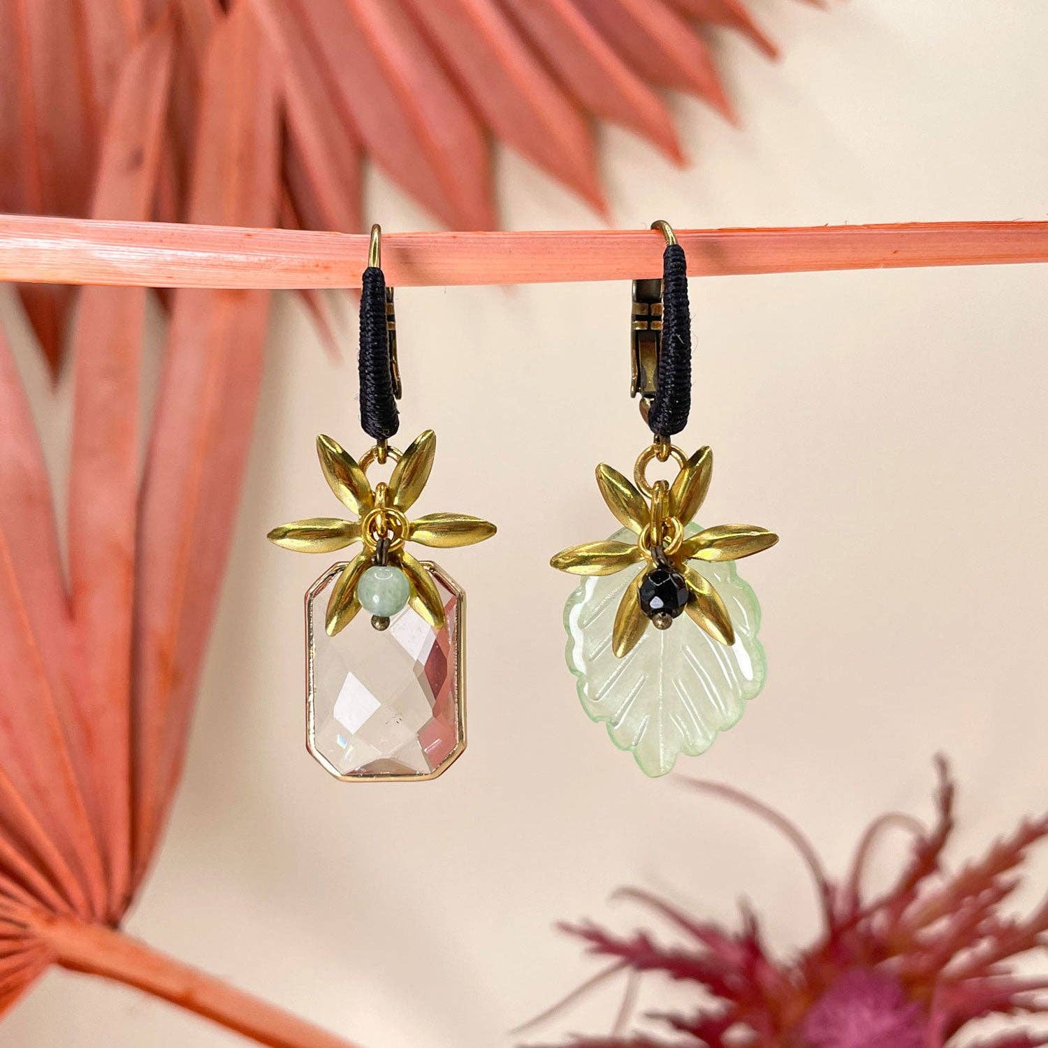 asymmetriska örhängen med mässingselement, fasetterade kristaller, zirkonkedja, platta pärlemorpärlor och silkestråd längd: 5 cm stängningstyp: hävstångslås färg: mint/het rosa