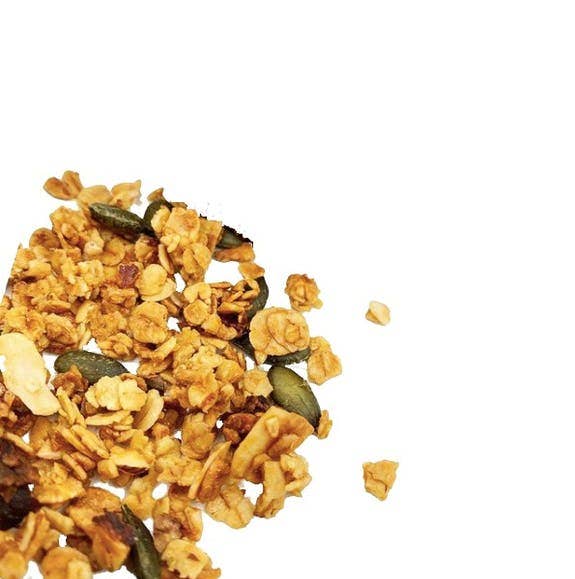 Ingredienser: Spirade mandlar, dadlar, pekannötter, sesam, linfrö, solrosfrön, pumpafrön och acerolakörsbär. Ekologisk, kornfri, glutenfri granola, sötad enbart med hela organiska dadlar (inte ketovänligt). Inget tillsatt socker, inga sötningsmedel. En bra källa till kostfiber, Omega 3, och växtbaserat protein.