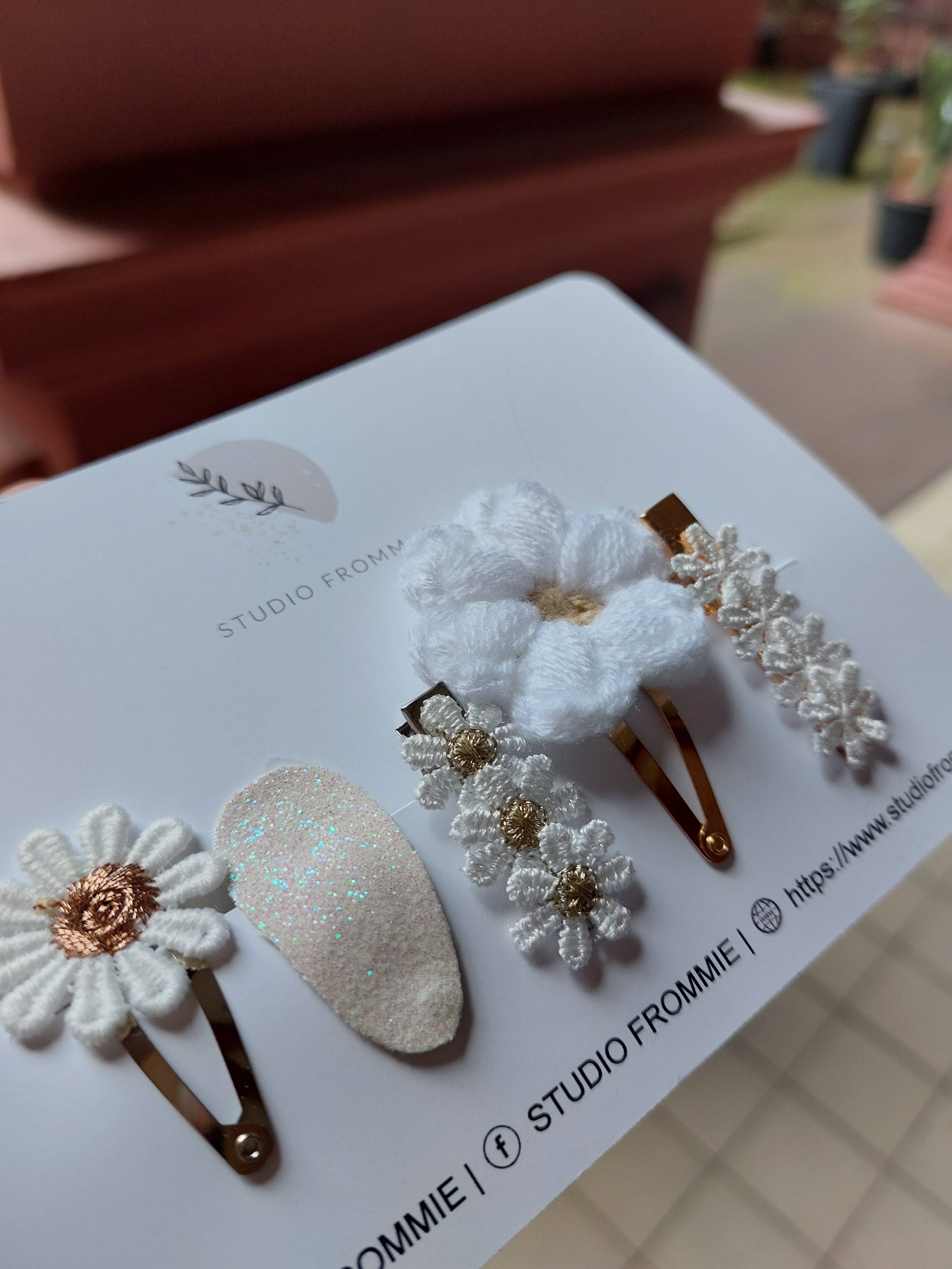 Ordentligt limmat, ovanliga designer. Vi älskar de virkade blommorna så mycket. Det är också fantastiskt att det finns små spännen. Kvaliteten motsvarar priset. Vi har redan gjort nästa beställning.