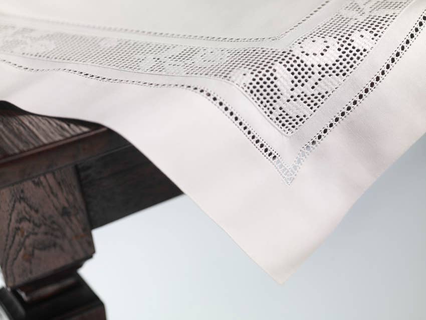 Denna rena vita duk är både festlig och elegant. Den imponerar med den högkvalitativa, handgjorda dubbla korssömmen längs en enkel fåll. Duken tål maskintvätt upp till 95 °C, men bör centrifugeras skonsamt och det enklaste är att stryka den medan den fortfarande är lätt fuktig. Tillverkad med traditionellt hantverk, fokuserar INDRADANUSH på rättvis handel och hållbarhet (certifierad av WFTO). Textilierna tillverkas uteslutande av oberoende brodöser som arbetar hemifrån på landsbygden i Vietnam.