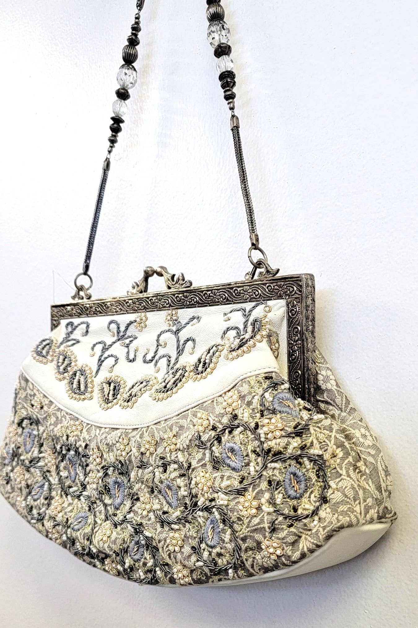 KLASSISK HANDBRODERAD CREWEL BRODERAD VINTAGE MÄSSINGSRAMKOPPLING, HELT FODRAD MED MÄSSINGSKEDJEHANDTAG