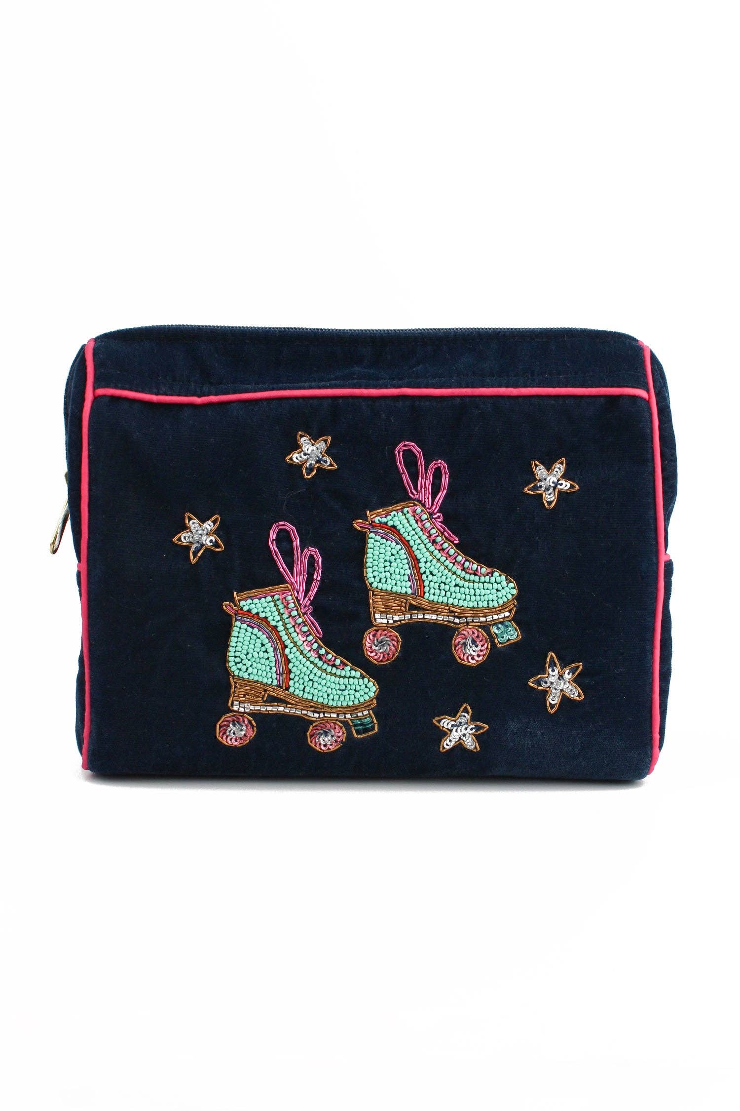 Rulla in i säsongen med ett nytt motiv. Vår retro rullskridsko finns som necessär i två storlekar (small och medium) samt som nyckelring. - Handgjord av skickliga hantverkare i Indien. - Cirka 145 x 110 mm med 40 mm botten. - Tillverkad i 100 % polyesterflanell med ett vattentätt foder och prydd med glasspärlor.