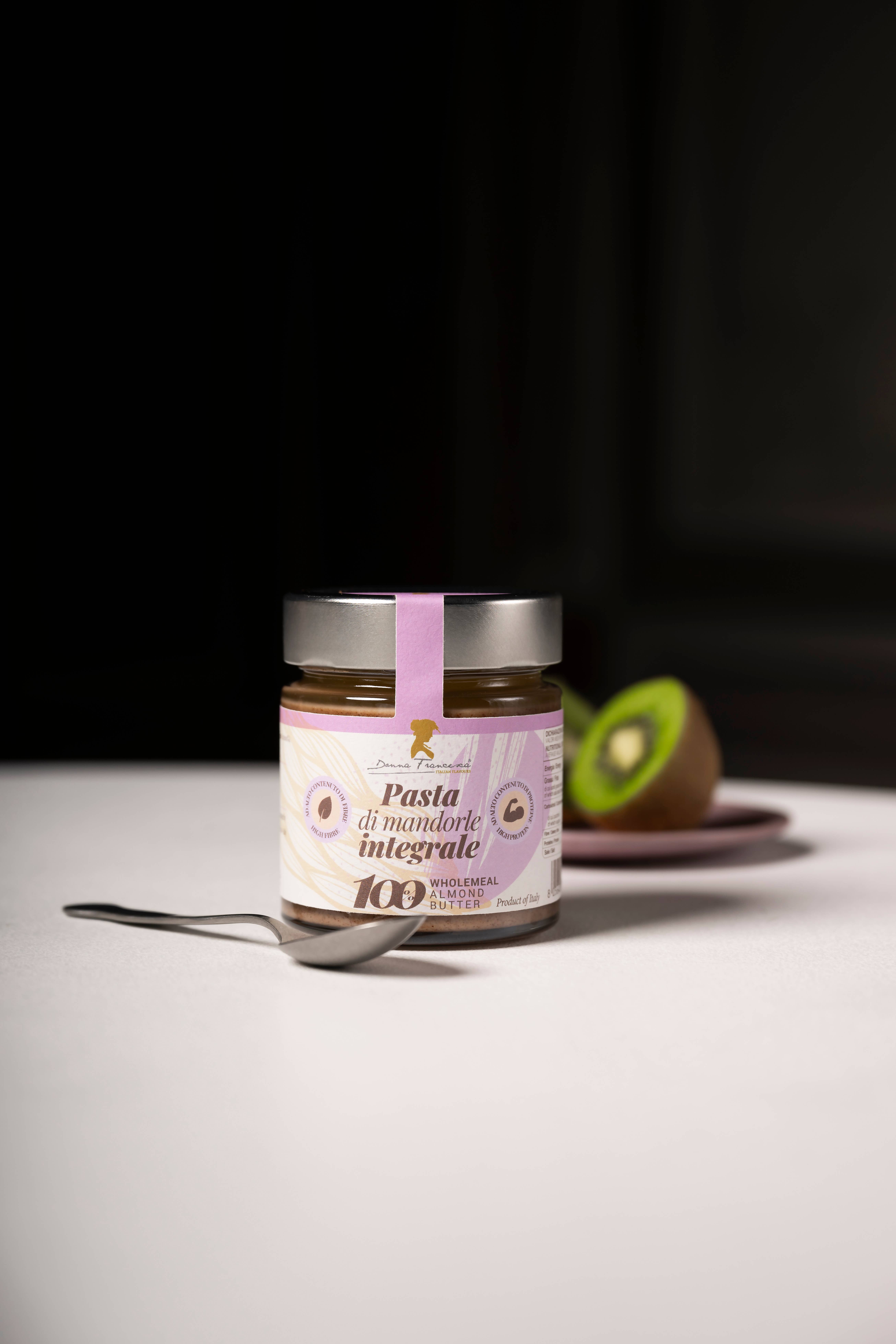Donna Francesca 100 % mandelpasta är gjord på skalade mandlar som rostats och finfördelats vid låg temperatur tills de blivit en pasta med krämig konsistens. Den delikata och harmoniska smaken kommer från mandeloljornas mildhet, som förhöjs genom rostningen och ger toner av kaffe, korn och torkad frukt. Mandelpasta är mångsidig och kan användas i både matiga rätter som kyckling med mandel, tillsammans med kallskuret och ost, pesto och hummus på baljväxter. I söta rätter är den oumbärlig för glass, mandeldesserter, kungliga bakverk och som fyllning i croissanter tillsammans med sylt. Den passar även utmärkt i bakning och vid tillagning av jästa bröd som pizza och focaccia. I kombination med torkade tomater, olja eller yoghurt är den bas för såser som passar till sallader, kött och fisk.