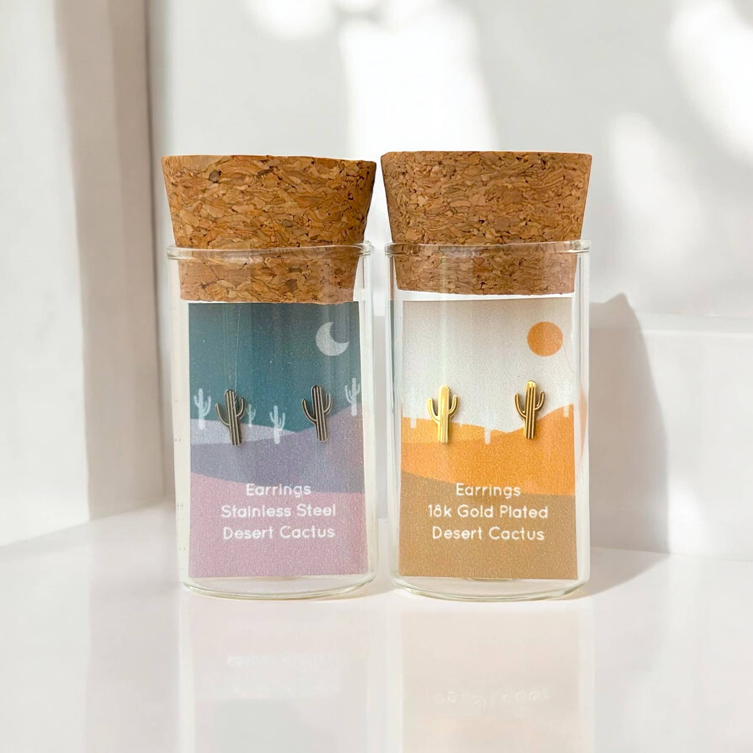 Hypoallergena mini dubbade örhängen Tidlös minimalistisk stil Wish Upon a Star Tiny Studs med match och striker-klistermärke på burk Färgalternativ: Kirurgisk stål 18K guldpläterad över kirurgiskt stål 18k roséguldpläterad över kirurgiskt stål 3.5mmx3.5mmx1mm tjock Levereras förpackad i en glasflaska med en korktopp. Glasflaska kan återanvändas för förökning av små växter