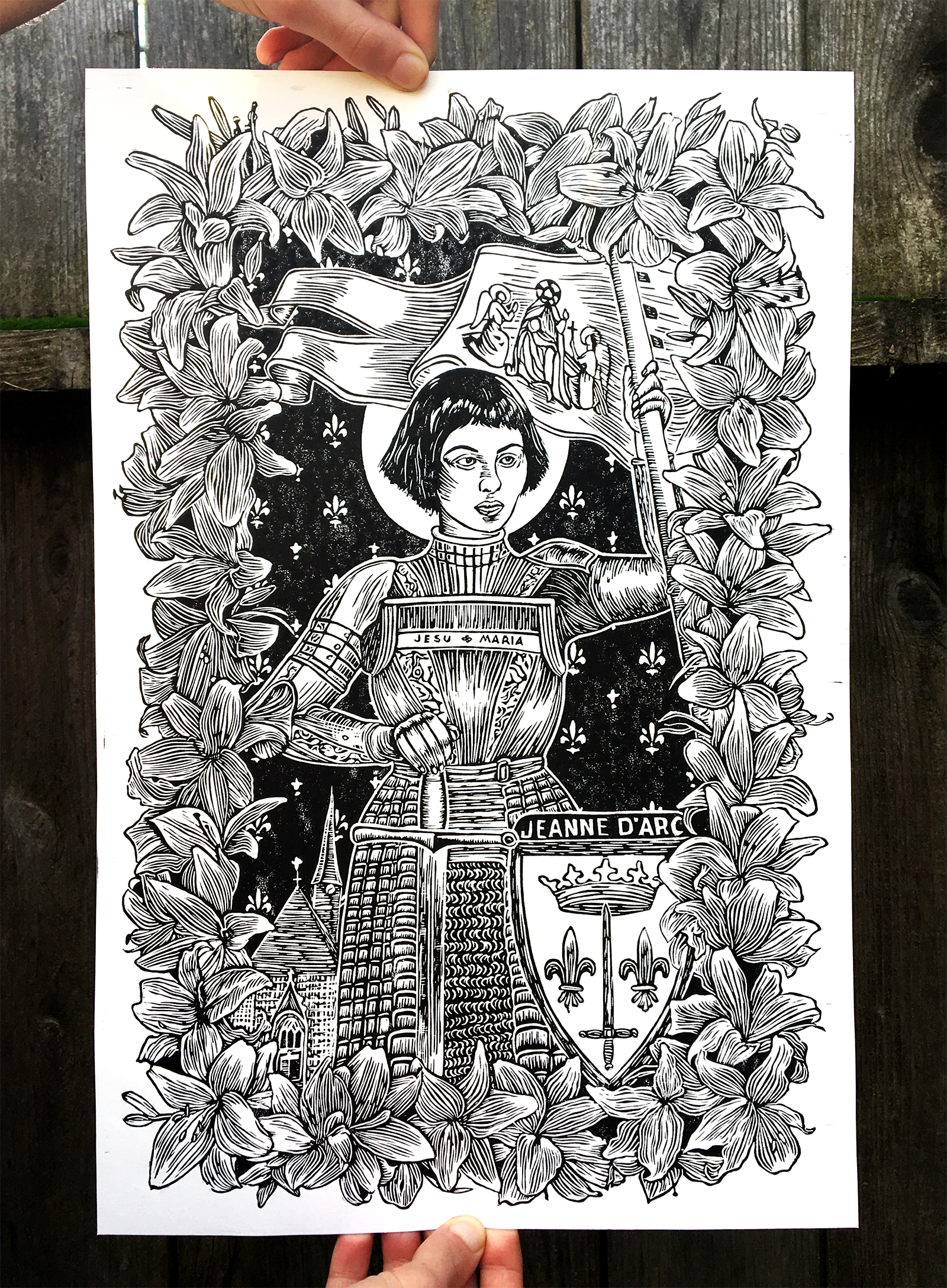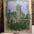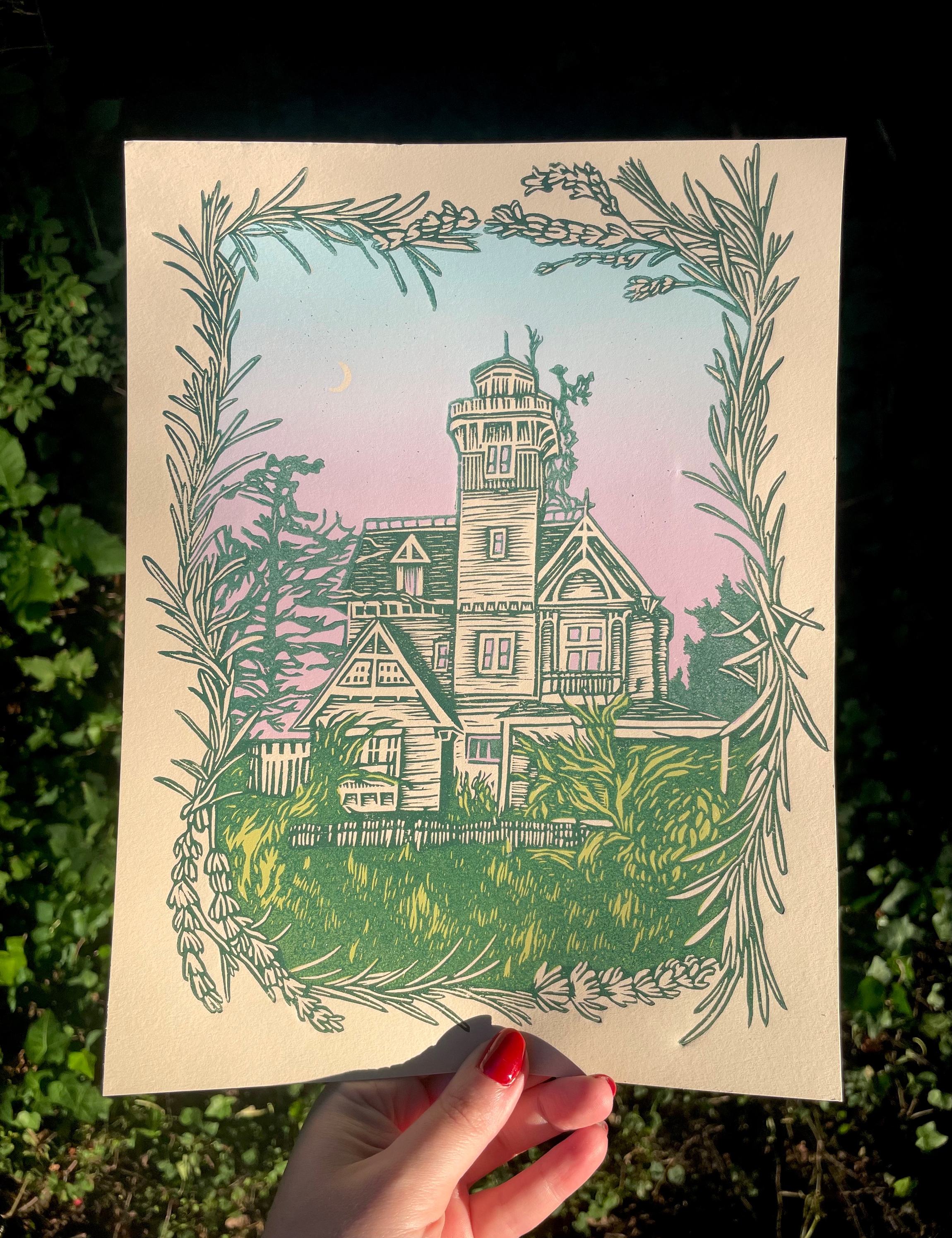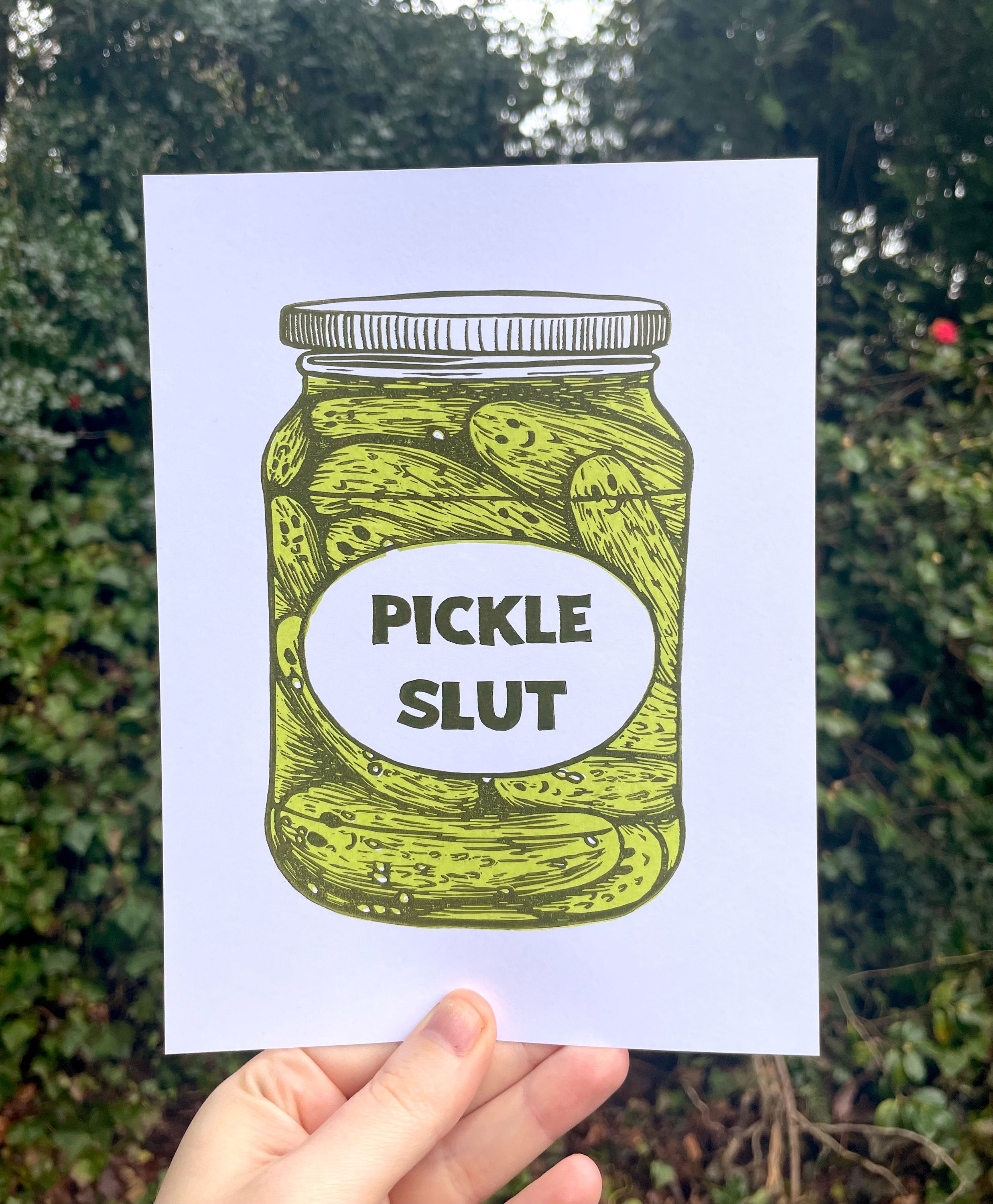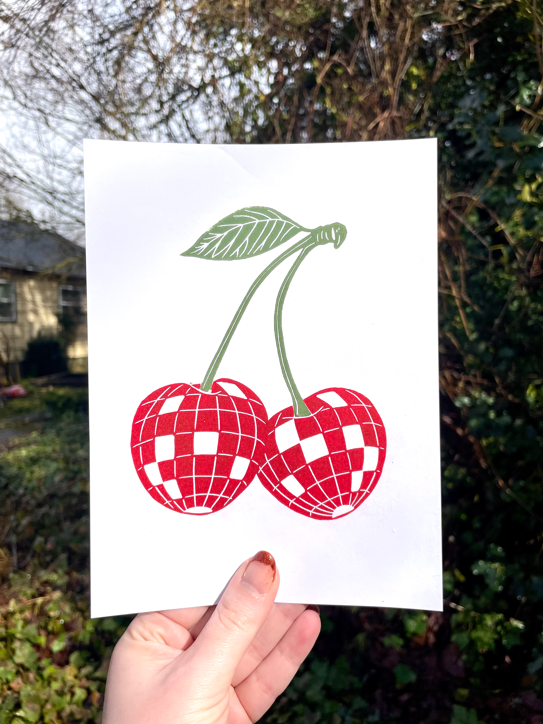 Detta är ett linocutstryck av disco bollsvampar! 6x8" tryckt med metalliskt silverbläck. Vad är ett linocut-tryck? Ett linocut-tryck skapas genom att snida en design i ett block av linoleum, rulla bläck på ytan och lägga papper eller tyg ovanpå och sedan applicera tryck för att producera ett tryck. Det är en relieftrycksprocess som mycket liknar träsnitt.