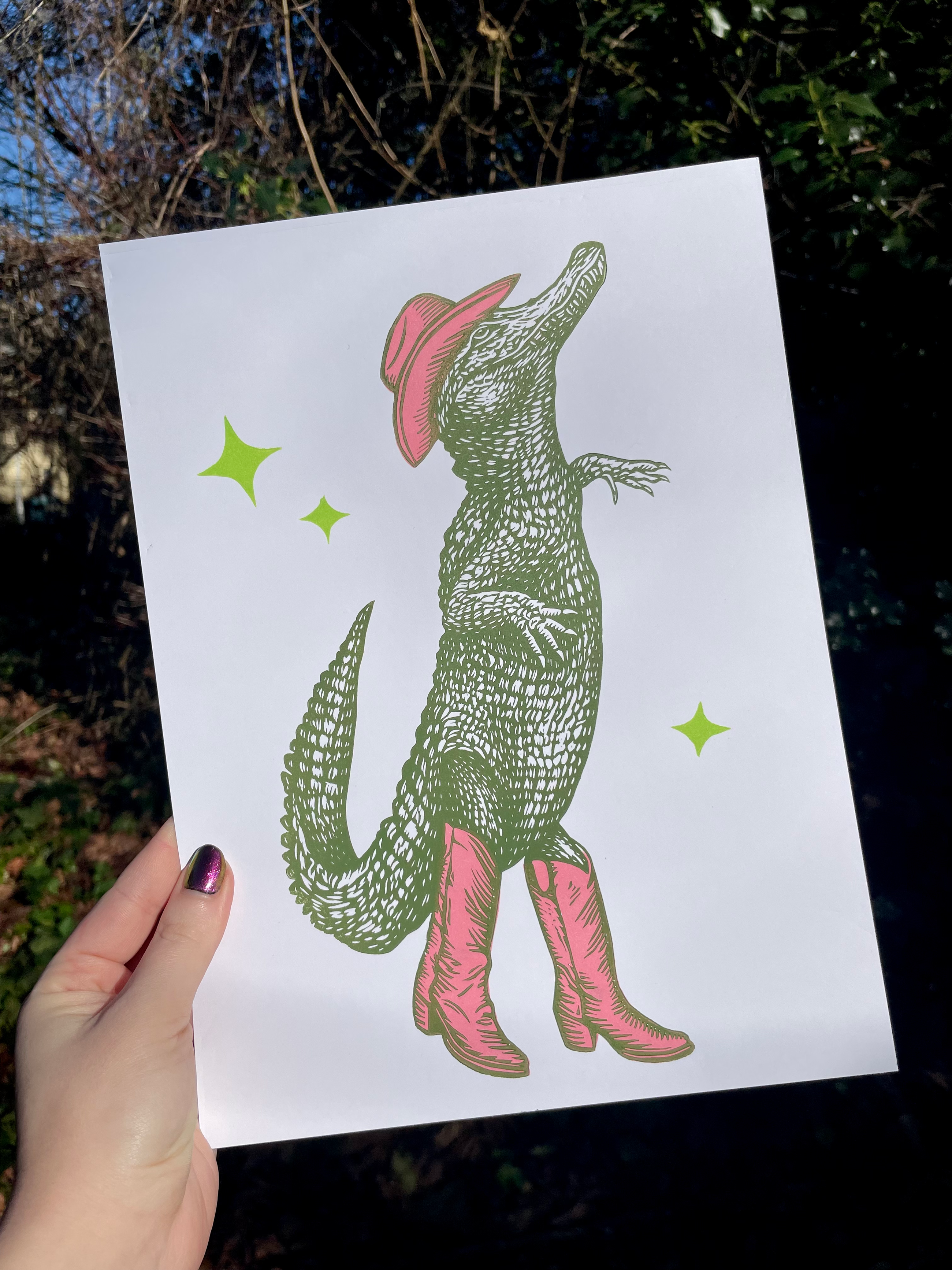Vi sålde slut på trycket med alligatorn i cowboyboots inom bara två dagar efter att det kom ut på vår försäljningsyta här i Louisiana! Räkkatten är nästan slut också. Bravo!