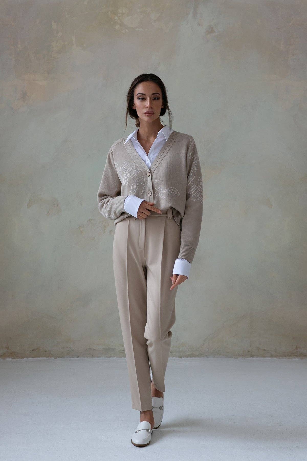 Lyft din kollektion för kallt väder med denna snygga baskofta för kvinnor. Designad i en avslappnad, fritt skuren silhuett, denna kofta har en klassisk triangulär halsringning och en droppad axellinje, vilket garanterar både komfort och mångsidighet. Knapparna är perfekt anpassade till koftans färg och bibehåller en sömlös, polerad look. Som en charmig touch har vi lagt till en delikat rosdetalj, vilket gör detta plagg unikt elegant och perfekt för att para ihop med en veckad kjol. Minsta beställning på £500 på alla produkter av alla storlekar från kollektionen. Det beräknade leveransdatumet är 14 dagar från beställningsdagen. Högkvalitativa produkter, tillverkade i Ukraina med kärlek och mod 💙💛
