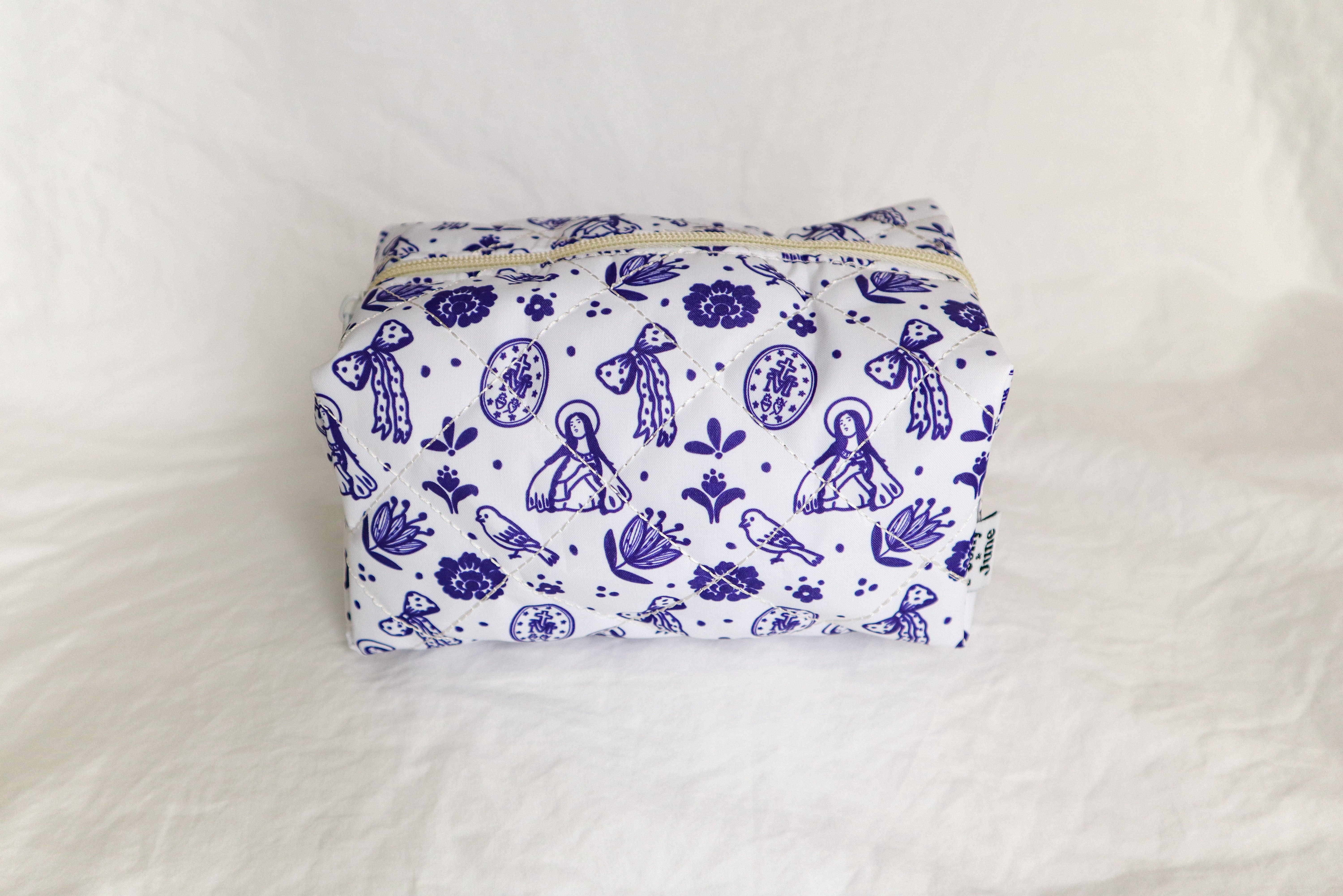 Håll dina nödvändigheter organiserade med denna vackert quiltade väska med ett charmigt helgonmönster. Designad för katolsk hängivenhet och vardaglig praktisk användning, är denna väska perfekt för att hålla pennor, radband, bönkort, kosmetika eller små tillbehör. Produktinformation: * 7,5 x 5 x 4 tum i storlek * Tillverkad av polyester * Fodrad med gulrutigt tyg för hållbarhet och struktur * Stängning: Säker dragkedja * Design: Katolskt helgonmönster ©Peony&June alla rättigheter förbehållna - kopiera inte