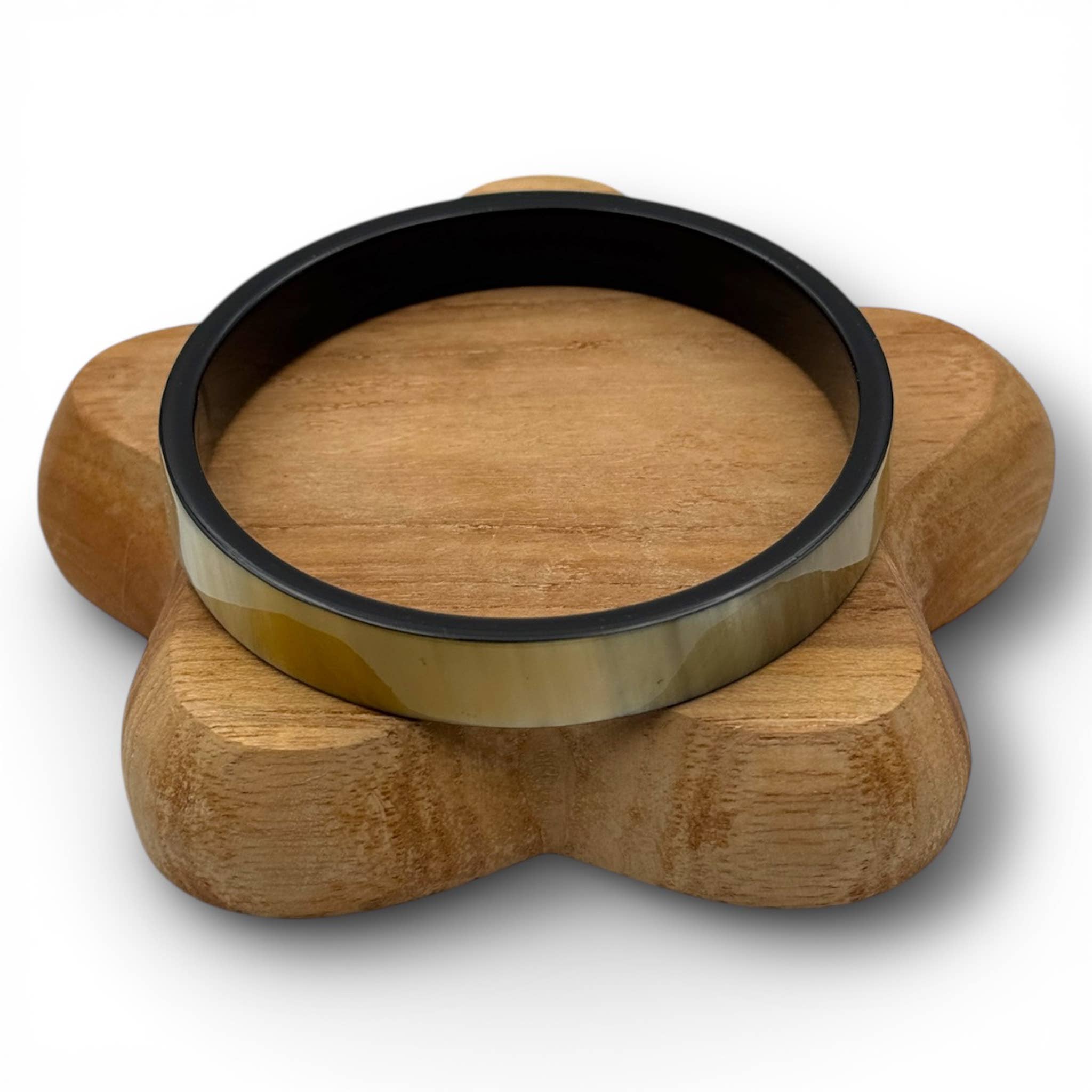 Dessa armband är handgjorda av hantverkare av buffelhorn. Varje armband är ett unikt exemplar. Eftersom produkten är naturlig varierar nyanserna mellan olika delar. Storleken är cirka 6,3–6,5 cm. För att skydda ditt smycke, undvik kontakt med vatten och parfym. Hörnen samlas in på ett miljövänligt sätt.