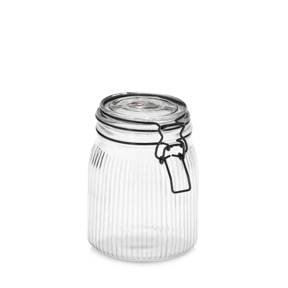 Praktisk förvaring med stil! Denna förvaringsburk med en kapacitet på 550 ml kombinerar funktionalitet med en elegant design. Den räfflade glasstrukturen ger den ett modernt utseende, medan den svarta bygelstängningen säkerställer en lufttät förvaring. Perfekt för torra livsmedel som nötter, müsli eller kryddor, så att innehållet håller sig fräscht och aromatiskt länge.
