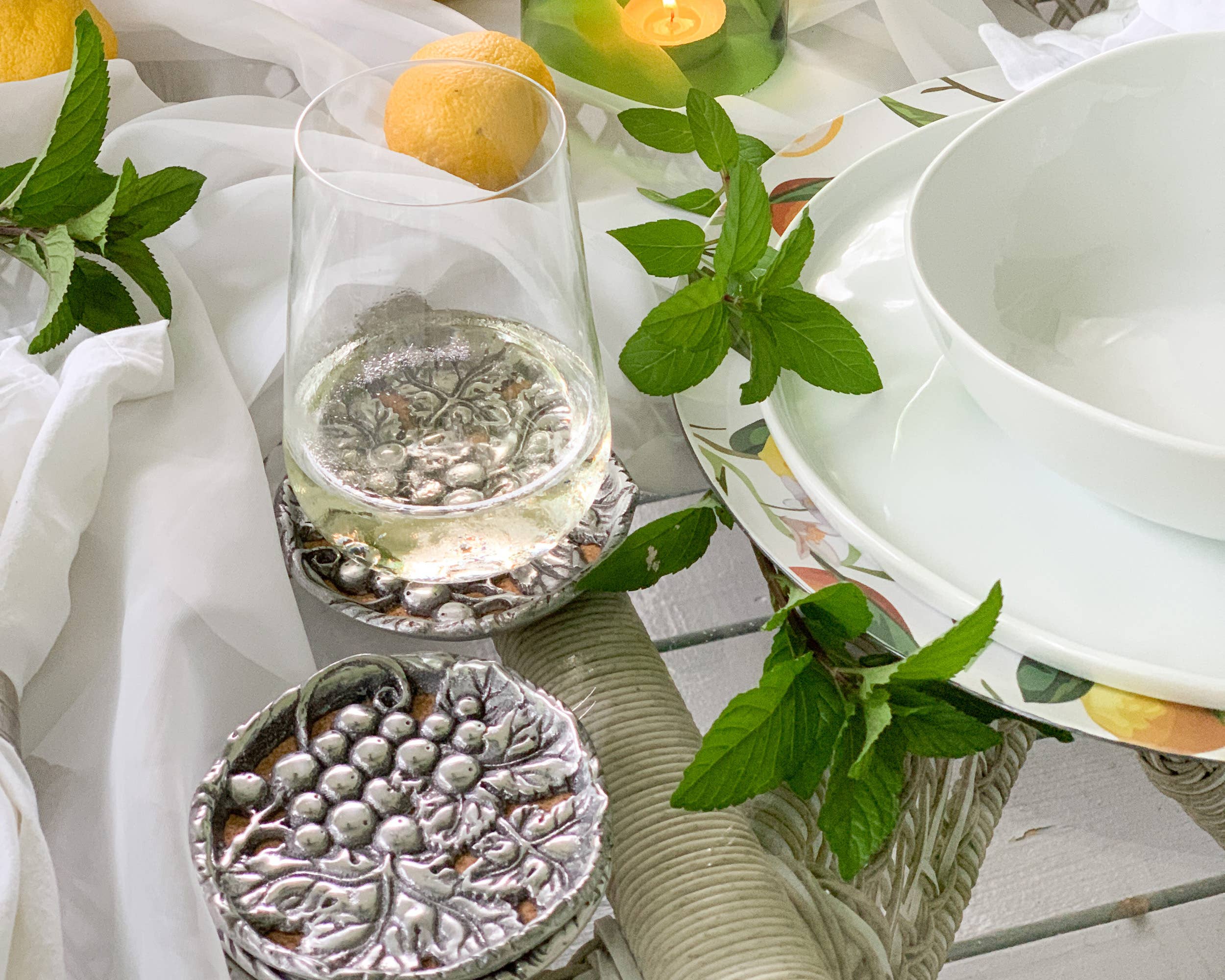 Tre högpolerade metallskålar, Arthur Court Signature Sandgjutna aluminiumskålar förenas, fästa vid en rustik olivkvist, tung med mogen frukt. Fyll med ett sortiment av oliver, nötter och godis eller pålägg och tapenader, placera på ett bord och känna värmen i Toscana komma in i rummet. Skapa en soldränkt medelhavskänsla var du än serverar från Arthur Courts 3 Bowl Olive Condiment Server. Storlek: 9 ”L/9 ”W/4" T Skötsel: Tvätta för hand med mild diskmedel och torka omedelbart - lägg inte i diskmaskin.