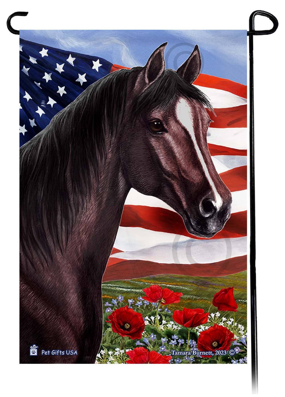 Denna Patriotic Flowers-flagga har en vacker Quarter Horse Strawberry Roan med en majestätisk amerikansk flaggbakgrund och underbara blommor fram och i mitten. Flaggan är tryckt på båda sidor med UV-beständigt bläck, mäter 12 ”x 18" och är stolt tryckt i USA.