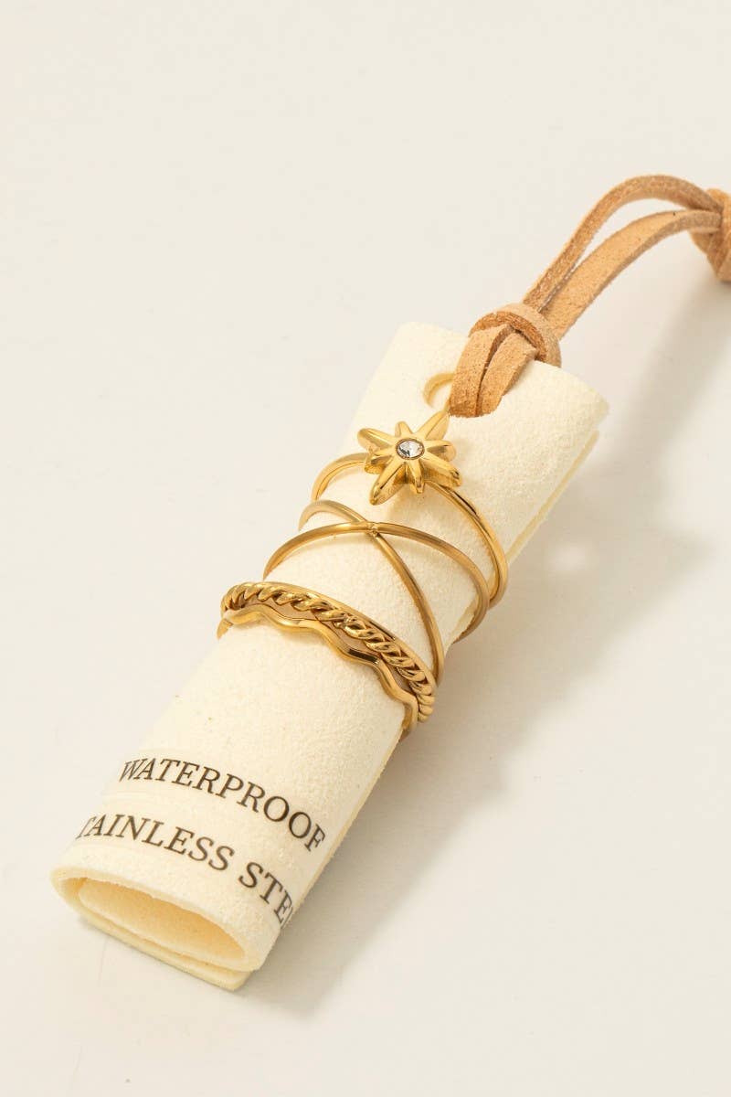 Detta ringset visar upp en tidlös baguetteslipad sten i ett 5-delat set av ringar i rostfritt stål. Upplev en subtil blandning av modernitet och klassisk charm när detta ringset smyckar din ensemble med lätthet. STORLEK 6,5-7, VATTENTÄT TILLVERKAD I KINA