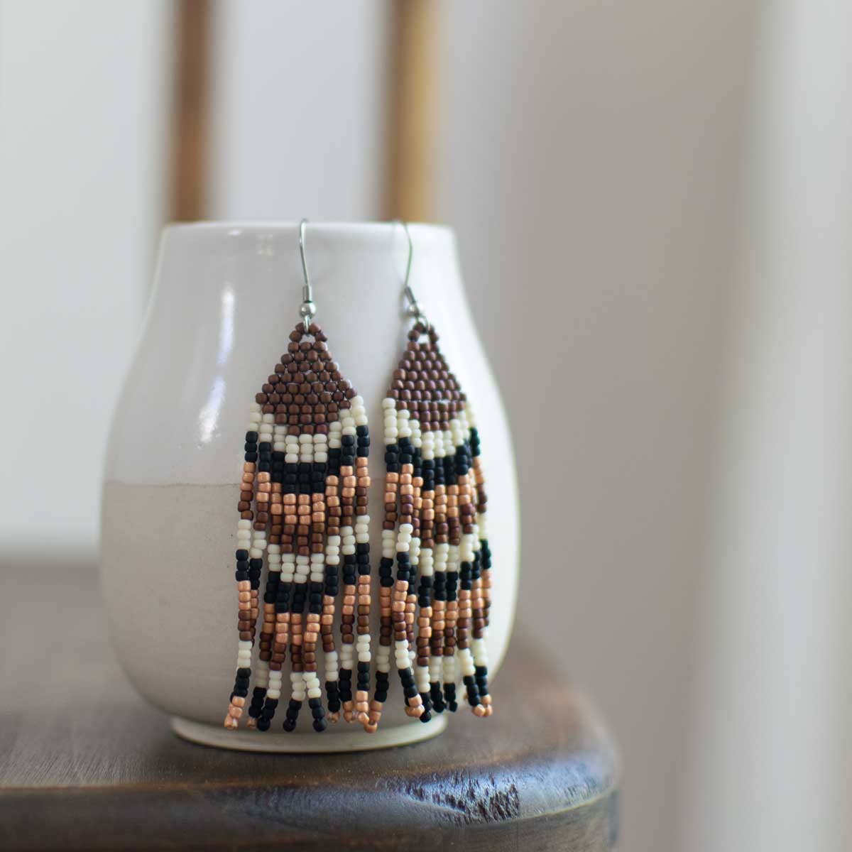 Dessa fair trade-pärlörhängen är det perfekta statement-smycket bland din enkla garderob. Lekfulla fransar under de vävda pärlorna ger en touch av nyckfullhet och rörelse till smycket. Det dekorativa mönstret skapas med kontrasterande färger av jadegrönt och beige som separeras av en matt roséguld. Tillräckligt lätta för att bäras bekvämt Omsorgsfullt vävda av kvinnliga hantverkare i Guatemala Enkla men slående * Mått Pärlarbetet är cirka 3 3/8" | 85 mm * Material matta seed beads, tråd och hypoallergena krokar i rostfritt stål