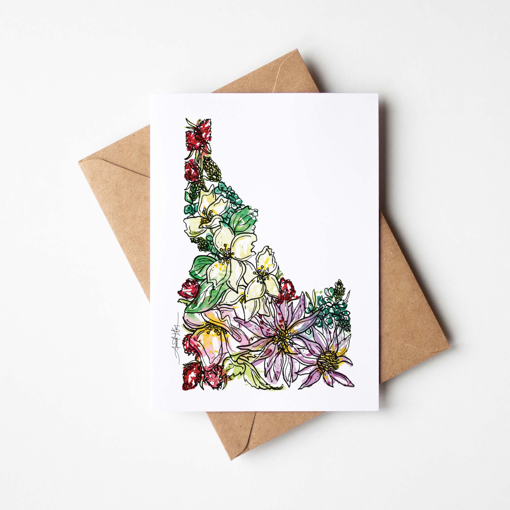 Detta kort har en ljus och vacker akvarelldesign av Amanda Klein. Dessa är enkla att lägga i korgen för vilken butik som helst och är en perfekt "ta med och gå"-artikel att ha vid kassan! DETALJER: - Innehåller: 1 tomt kort + 1 kraftkuvert, förpackat i ett genomskinligt cellofanhölje - Småskalig tryckning på tungt bomullspapper, 5 ½” x 4 ¼” - Kraftkuvert är återvunna, handgjorda, A2-storlek (5 ¾” x 4 ⅜”) - 100% tillverkad i USA - Kvinnoägt + drivet