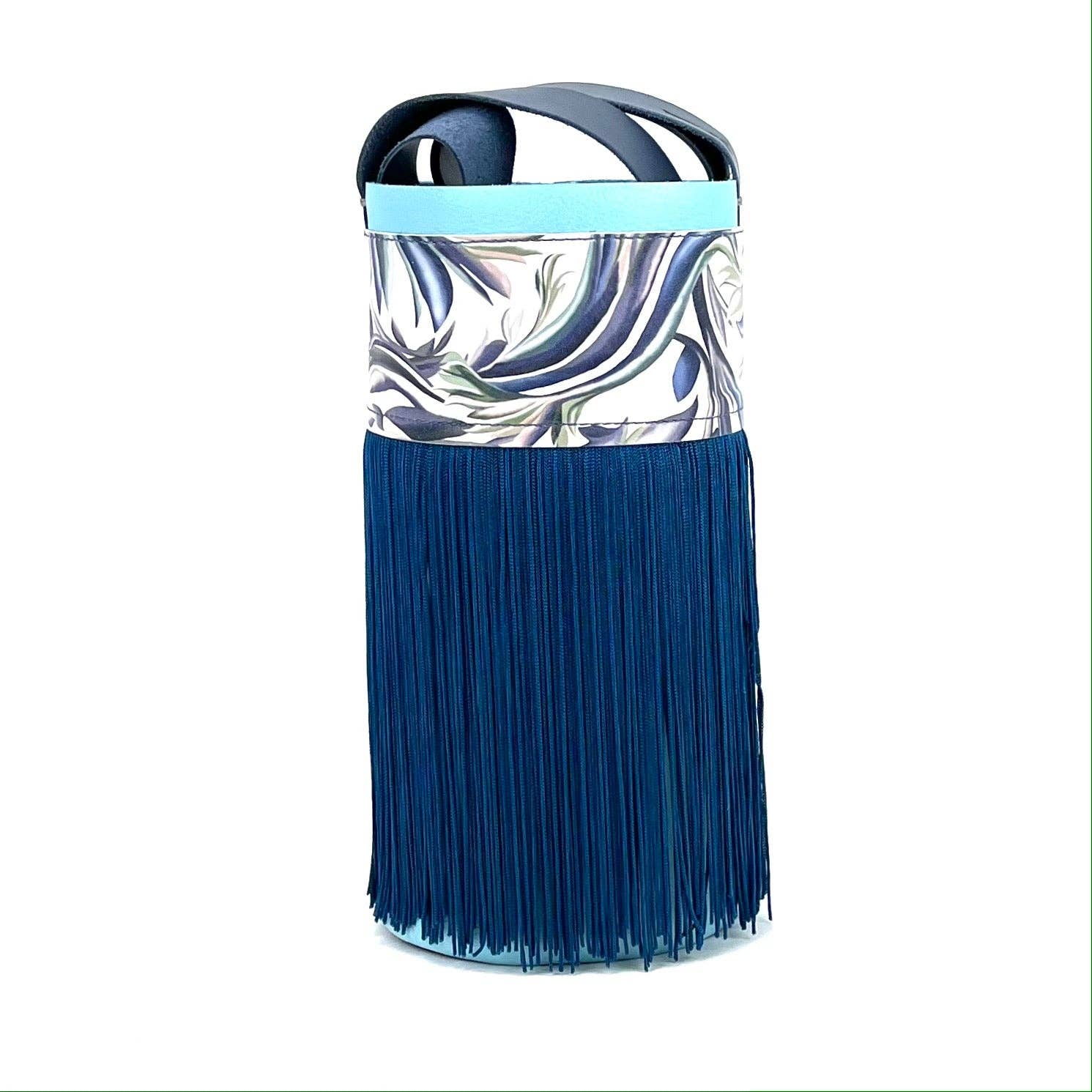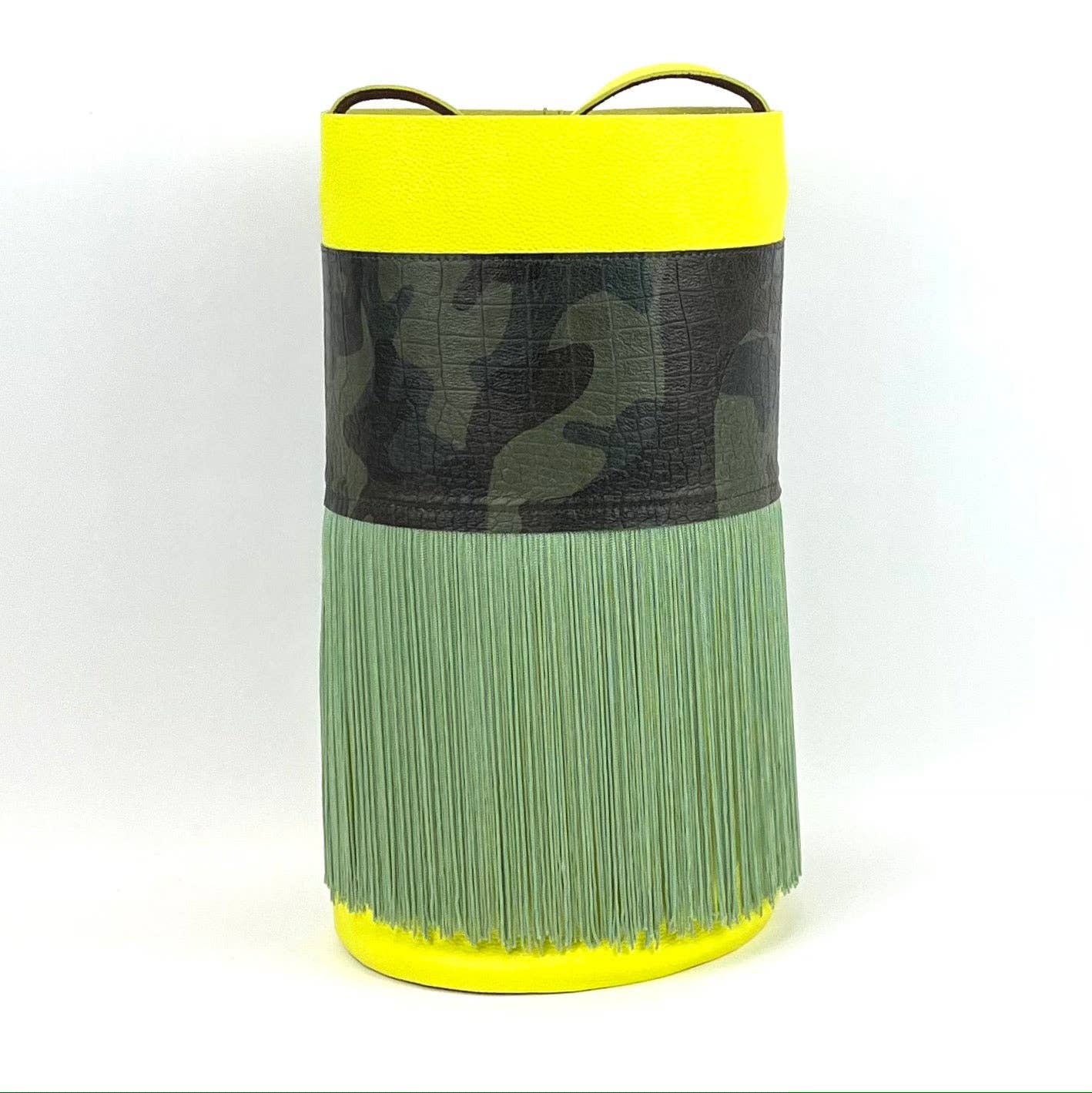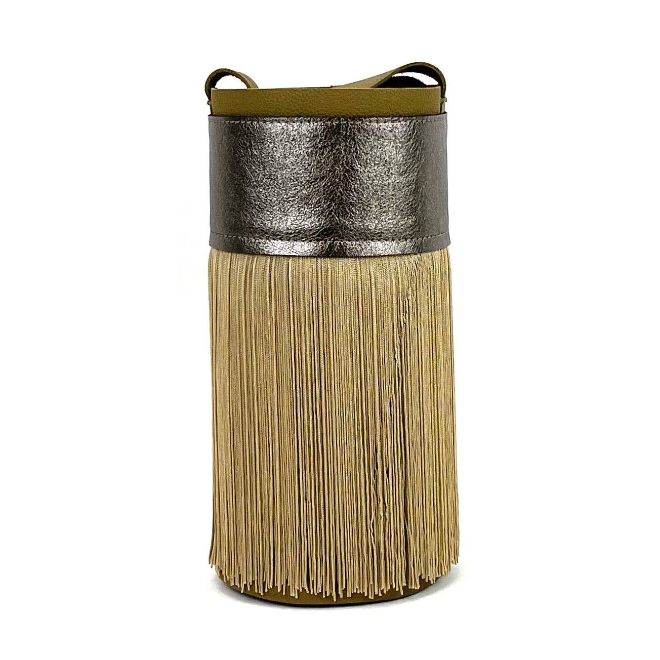 Minicubo modell väska i roséguld läder med sprucken effekt, applicering på kort hår och återigen ett roséguldläder med sprucken effekt, bas i champagnefärgat läder med sprucken effekt. Handtaget är tillverkat av brunt läder. Handgjord, exklusiv design, inga två är likadana. Mått: höjd 28cm, sockeldiameter 13cm, handtagets längd 98,5 cm ca. Trots dess dimensioner har denna väska storlek en stor kapacitet. Den kan bäras korsad eller hängas på en axel. ”Ofullkomlighet gör dem unika.”