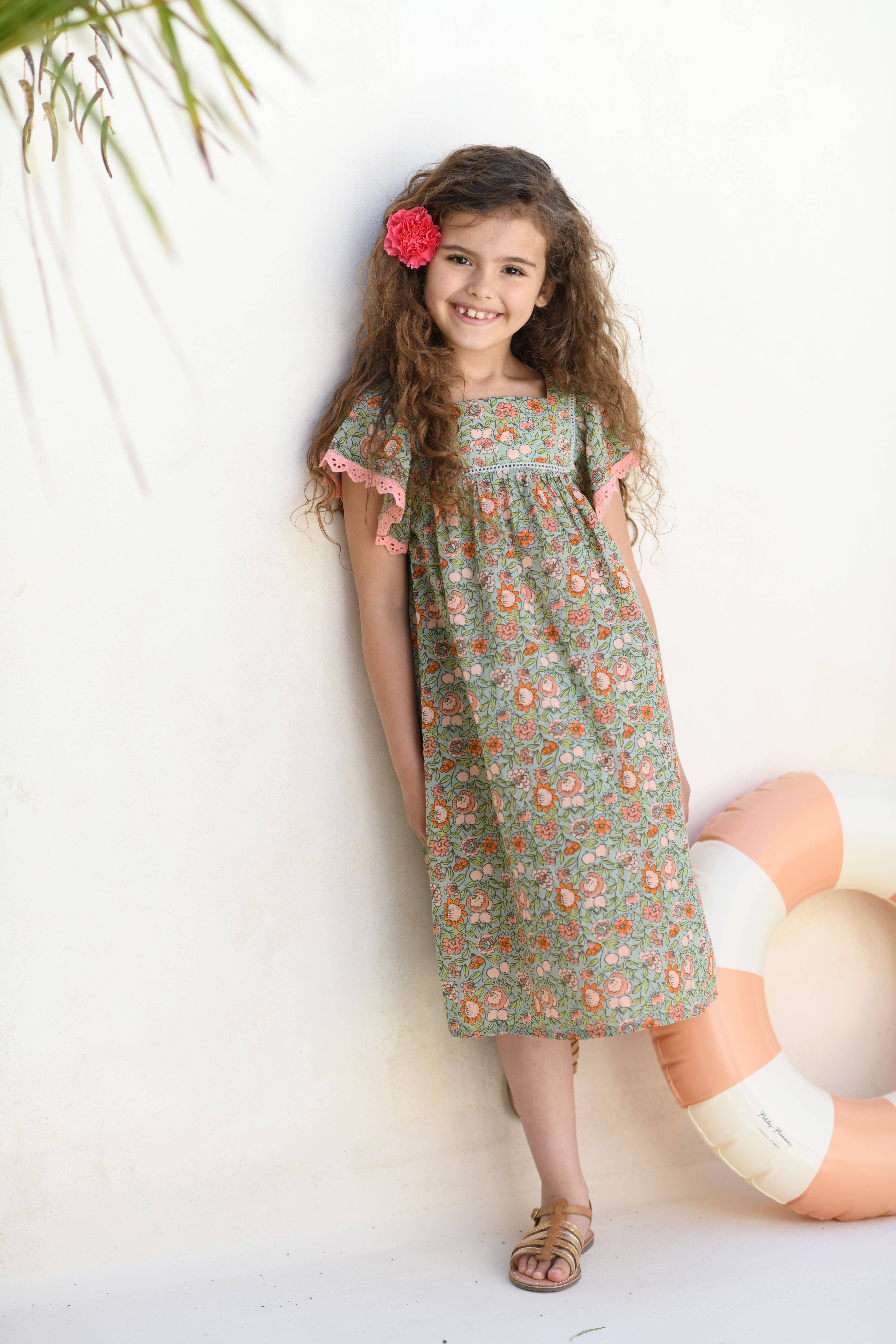 Flickklänning med veckad spets och blommor, storlek 4-14