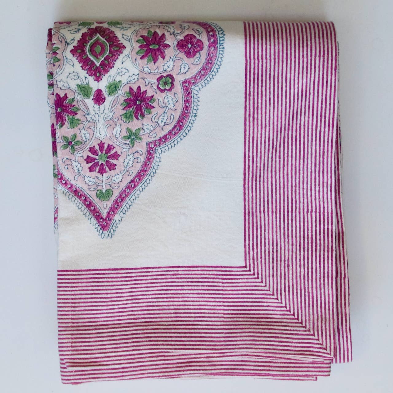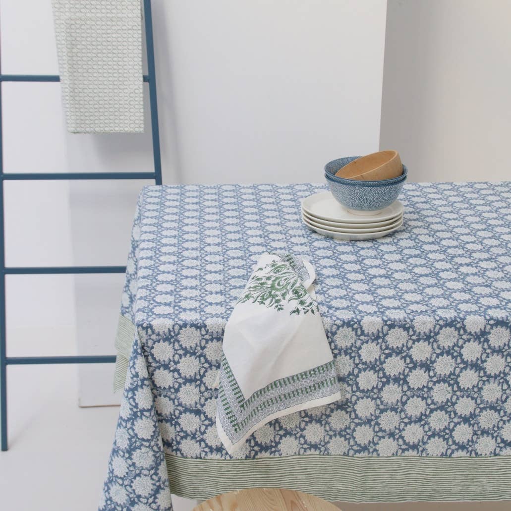 Handtryckt och hantverkstillverkad duk i 100 % bomull, 150 x 150 cm, passar både fyrkantiga och runda bord. Duken är gjord i tjock och högkvalitativ 100 % bomull, med en lyxig känsla som håller i många år. Den skiljer sig från andra blocktryckta dukar genom sin unika kvalitet och handgjorda detaljer. Tvätta i 30°C för att bevara dess skönhet. Ge din matplats stil och charm med denna handtryckta duk, perfekt både för vardagsbruk och speciella tillfällen. Duken har en randig bård och finns även i storlekarna 150 x 240, 160 x 270 och 160 x 340 cm.