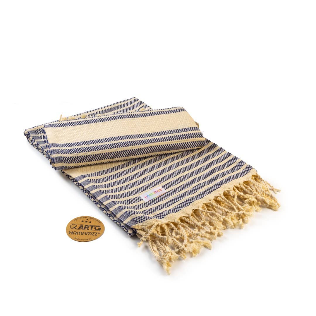 Hamamhandduk (modell AR051) tillverkad av bomullsgarn som erhållits från högkvalitativ bomull odlad i Turkiet. Denna mönstrade bomullspeshtemal är naturlig, hygienisk, mycket genomsläpplig, antistatisk, eldfast och absorberande. Den irriterar inte huden eftersom den är supermjuk. Peshtemal är en traditionell turkisk handduk med fransar. Det finns många sätt att använda denna handduk. Peshtemal används traditionellt i turkiska bad. Idag använder fler människor runt om i världen denna handduk eftersom den är lätt att ta med sig och torkar snabbt. Du kan också använda denna turkiska peshtemal hemma. Denna turkiska bomullshandduk har hög absorptionsförmåga och torkar snabbt tack vare att den inte innehåller kemikalier och är tillverkad av 100% naturlig bomull. Så eliminerar den turkiska handduken unken lukt. Dessa modemedvetna handdukar ger användarvänlighet både hemma och utomhus och är platsbesparande. Turkisk peshtemal förenar hundratals år av tradition med modern design och gör badet trevligare med en annan stil än alla andra handdukar. Peshtemal är en multifunktionell handduk som kan användas som strandhandduk, spahandduk, poolhandduk, pläd eller för andra dekorativa lösningar. Hamamzz-handdukar vävs traditionellt i Turkiet. Fransarna vrids och knyts för hand av kvinnor. Ett hantverk som går från familj till familj och som man är stolt över. Små vävfel är möjliga och hör också till produkten, de kan variera i färg och vikt. Peshtemal är en turkisk handduk som du också enkelt kan använda för dina barn med mjukt tyg och iögonfallande färger. Producerad enligt ARTG® säkerhetsregler - Produktionsfabrik med certifikat: Öeko-Tex certifierad - AMFORI - BSCI - SEDEX - ISO9001 - ISO14001 - ISO45001 - SMETA - Högkvalitativ bomull - 100% turkisk bomull - 425 gram - Finns i olika färger - Hållbart tillverkad - Made in GREEN
