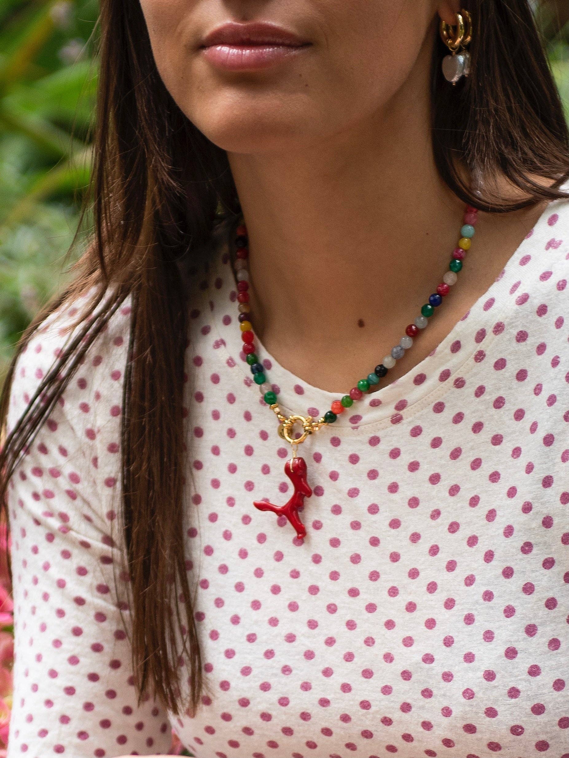 Detta delikata halsband med ädelstenar är ett säkert kort. Varje smycke är unikt, med olika halvädelstenar och en unik myntpärla. Uppkallad efter kuststaden i Connecticut, är Mystic en favorit hos märket, som kommer in i butikerna vid vårens första antydan och förblir populär hela sommaren. - Tillverkad i USA - Handgjord i Rhode Island - 14k guld fylld eller äkta 925 sterling silver pärlor och avslutningar - 16” + 2” förlängning - Äkta ädelstenar, 2-3mm - Hypoallergen, fläckfri, vattentät (undvik kemikalier, parfym, saltvatten)* Kaylie Dawn-smycken tilltalar kvinnor i alla åldrar med klassiska designer och högkvalitativ, handgjord konstruktion. Kollektionen lanserades 2020 och växte snabbt till ett urval av tidlösa smycken älskade av återförsäljare i USA, Kanada och Storbritannien. Kaylie Dawn Jewelry-kollektionen inkluderar: - Många ädelstenar och färger, massor av alternativ - Bekväma, lätta smycken - Långvariga, hållbara smycken - Smycken för känslig hud Dessa är halsband med ädelstenar, pärlhalsband, pärlsmycken, vattentäta smycken. Kaylie Dawn ser fantastisk ut tillsammans med andra samtida designer märken som enewton, Lizzie Fortunado, Chan Luu, Jane Win, Kris Nations, Mignonne Gavigan och många andra. Våra smycken säljer bra i exklusiva dambutiker, presentbutiker och kustsamhällen/strandbutiker. *Egenskaper som fläckresistens, hypoallergen och vattentät gäller för våra 14k guld-fyllda stilar. Andra material kan skilja sig åt.